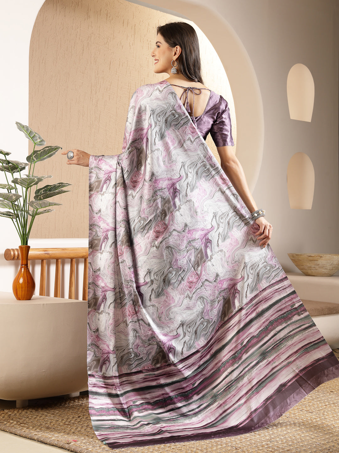 Stylum Women's Marble Print Satin Saree (SRMARBLEPURPLE)