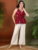 Maroon bandhej printed rayon sleeveless short top and cotton blend lurex pant set. Top has v-neck and shoulder tie-ups. Flared lurex pant has front belt and back elasticated waistband. Pair it with smart footwear and sling to enhance the look. Products Length- 25'' Inch, trouser length- 38''.