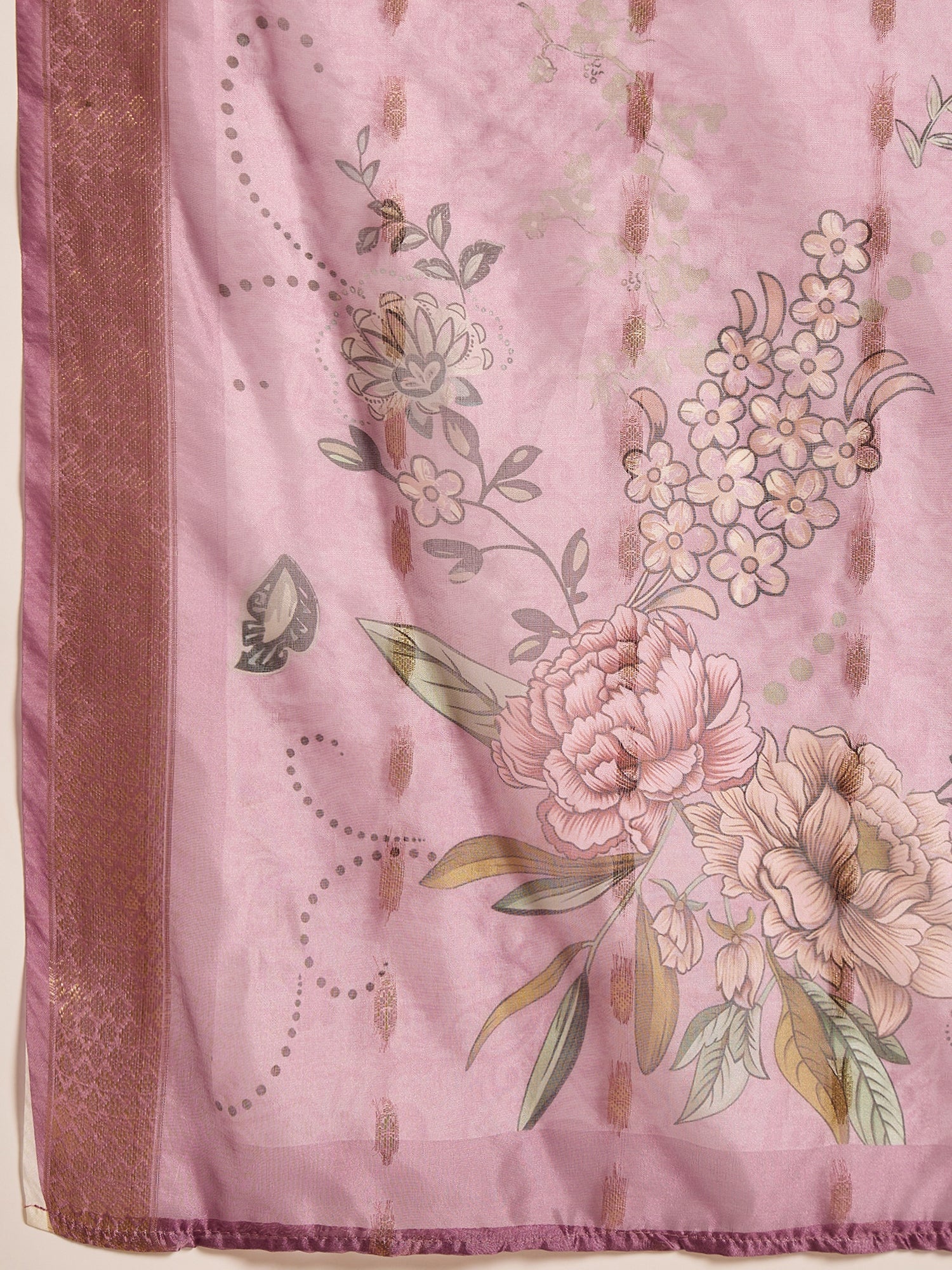 Mauve silk blend floral embroidered kurta pant dupatta set. Kurta has v-neck with embroidery border and regular sleeve's. Paired with silk blend solid fully elasticated waistbelt pant and silk blend printed dupatta. Kurta Length- 45" Inch, Pant Length- 38" Inch, Dupatta Length- 2.25 Mtr.