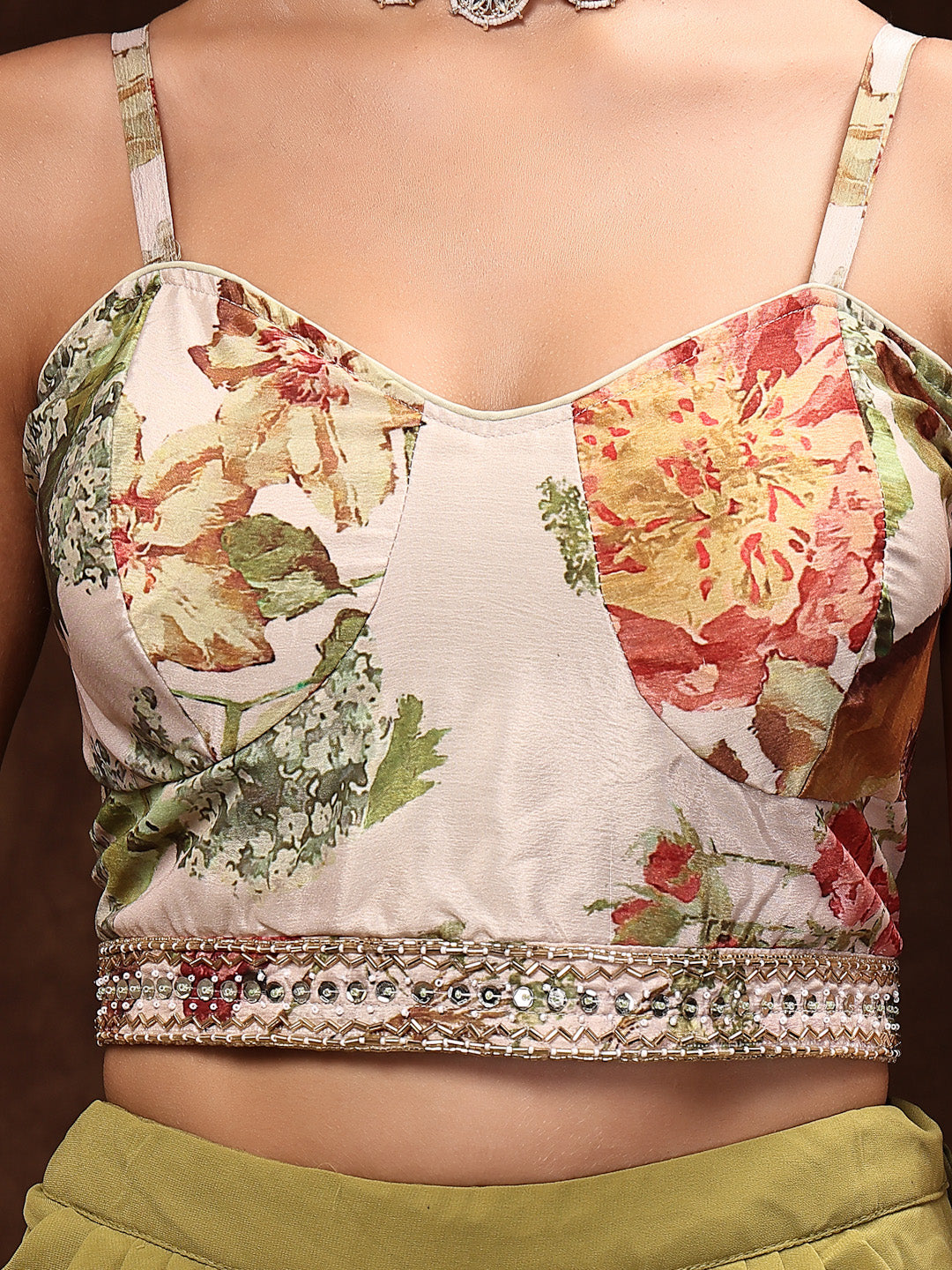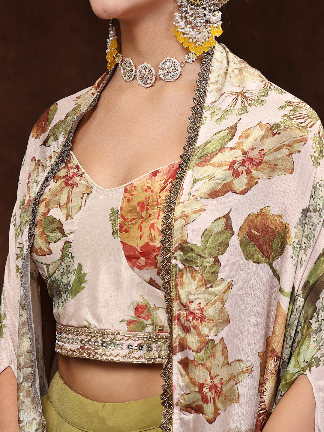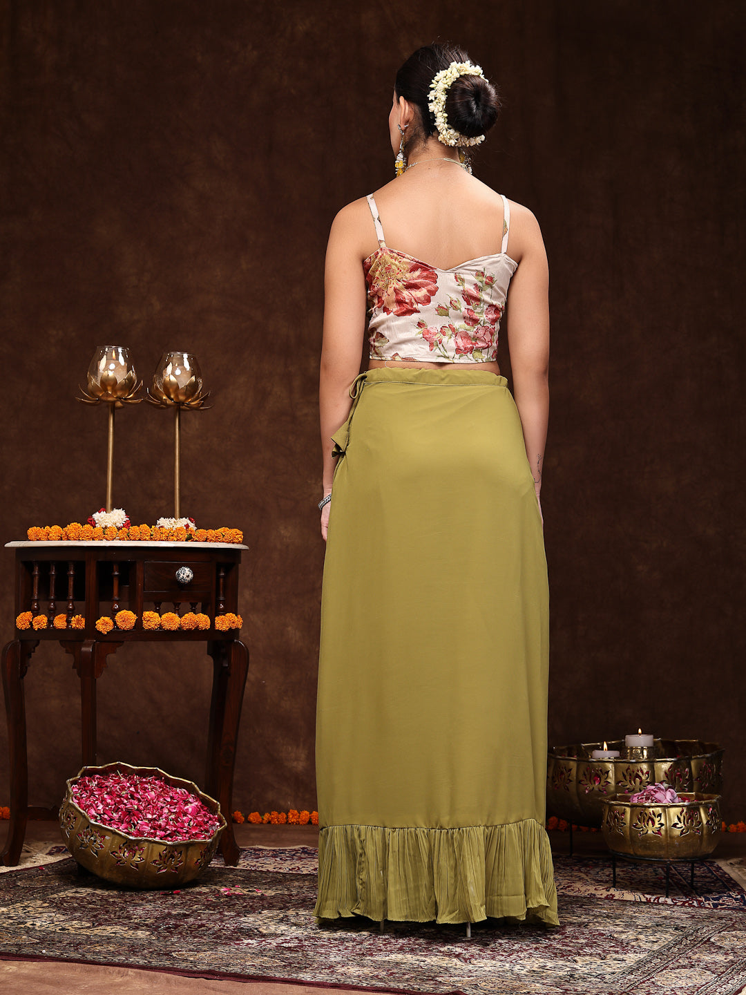 Stylum Women's Mehandi Printed Party Wear Georgette Skirt & Blouse with Jacket (PCJAMAIRAMEHANDI)