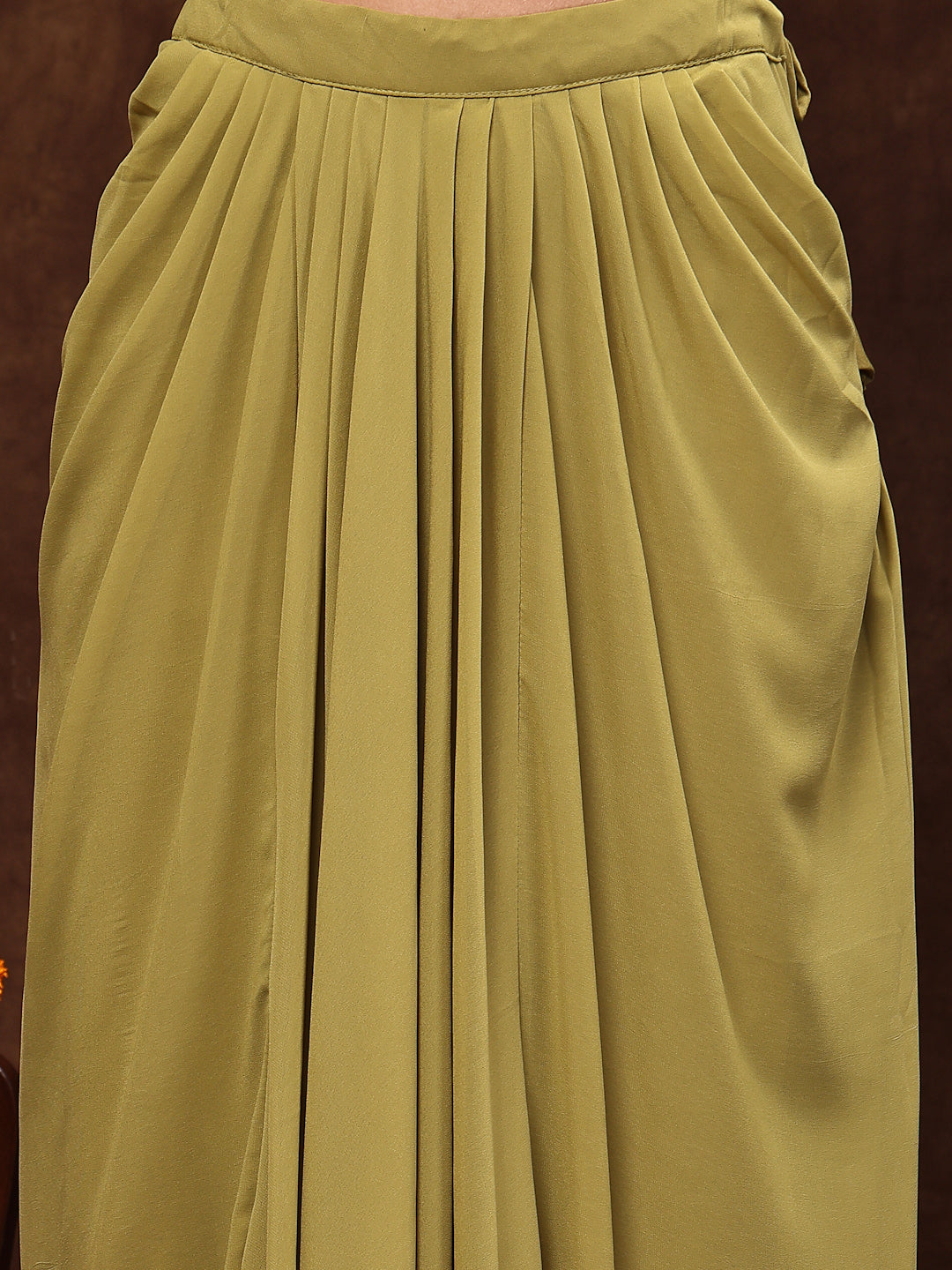 Green partywear solid georgette skirt with printed blouse. This has printed jacket and sleeves fabric inside. Blouse Length - 15'' Palazzo Length - 38''.