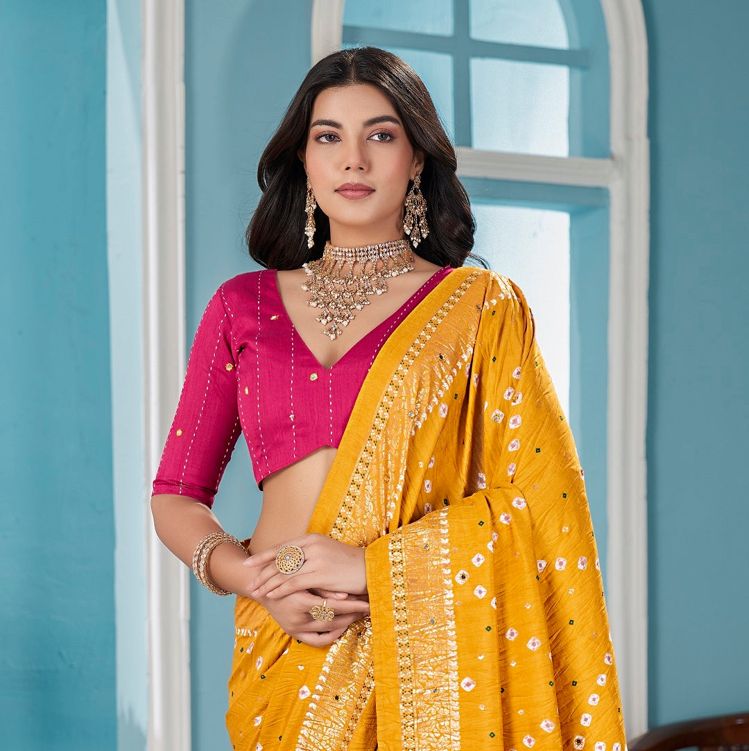 Mustard traditional bandhani tussar silk saree. Crushed silk saree with mirror aari work and foil border. It has unstitch blouse. Saree Length - 5.50 Mtr, Blouse Fabric Length - 0.80 Mtr