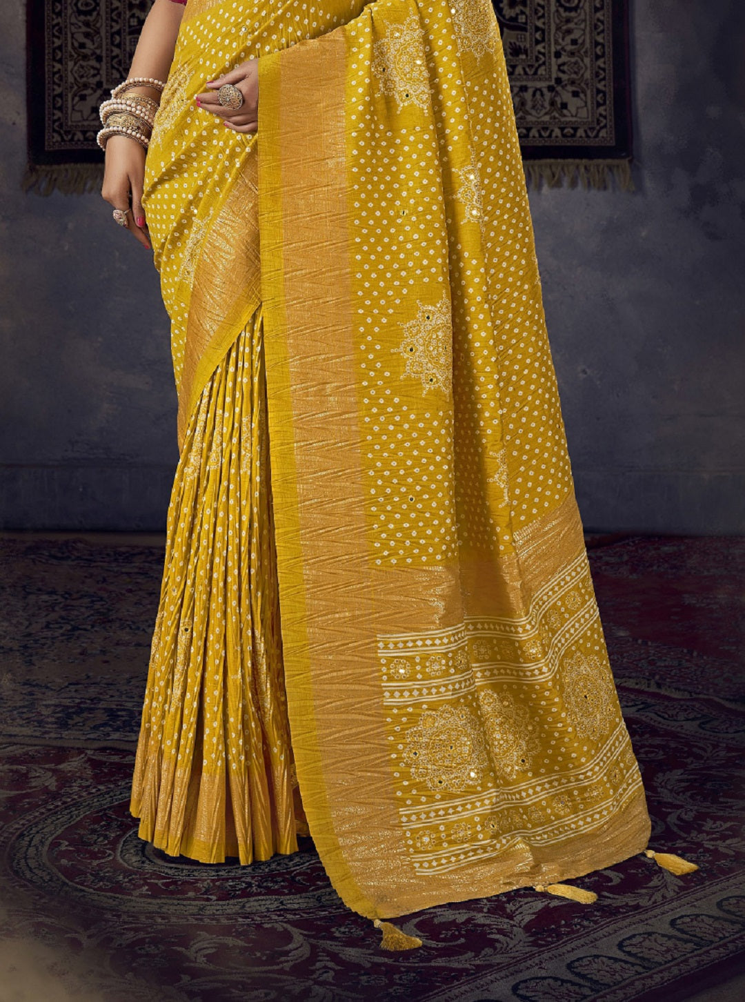 Mustard traditional bandhani tussar silk saree. Crushed silk saree with mirror aari work and foil border. It has unstitch blouse. Saree Length - 5.50mtr, Blouse Fabric Length - 0.80mtr.