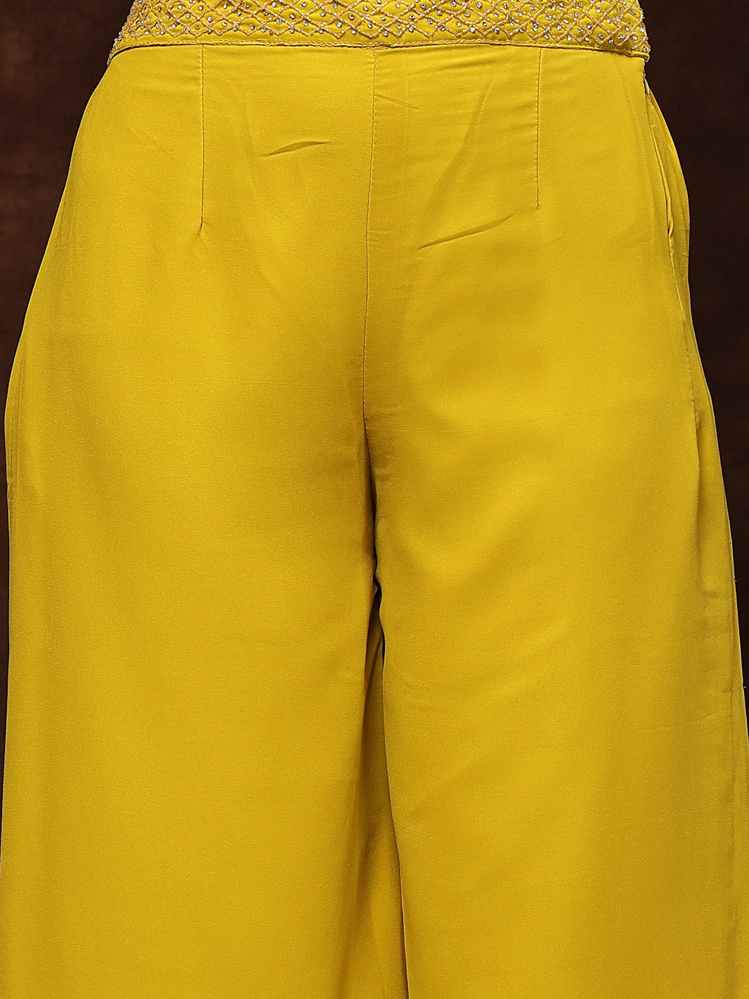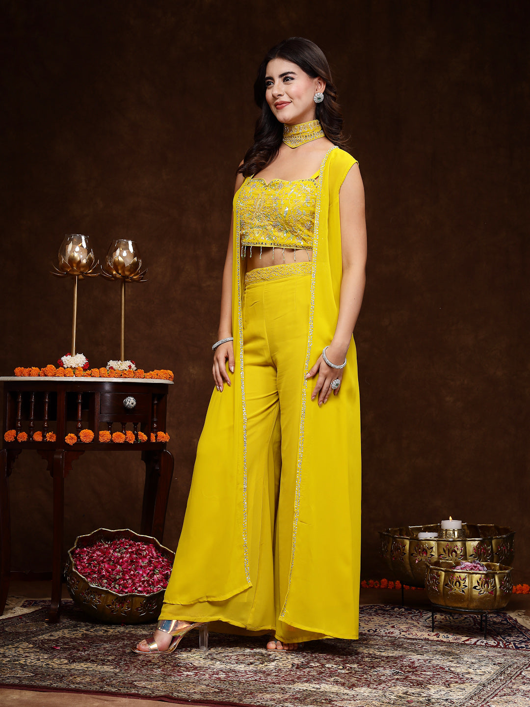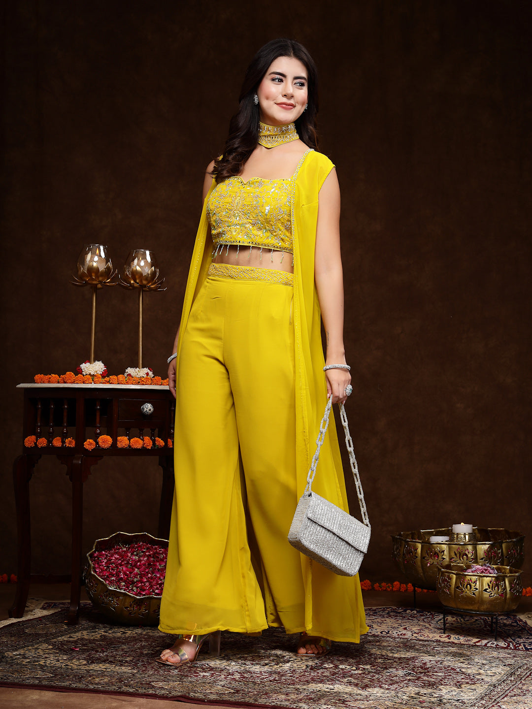 Stylum Women's Mustard Embellished Party Wear Georgette Palazzo & Blouse with Jacket (PCJARIANAMUSTARD)