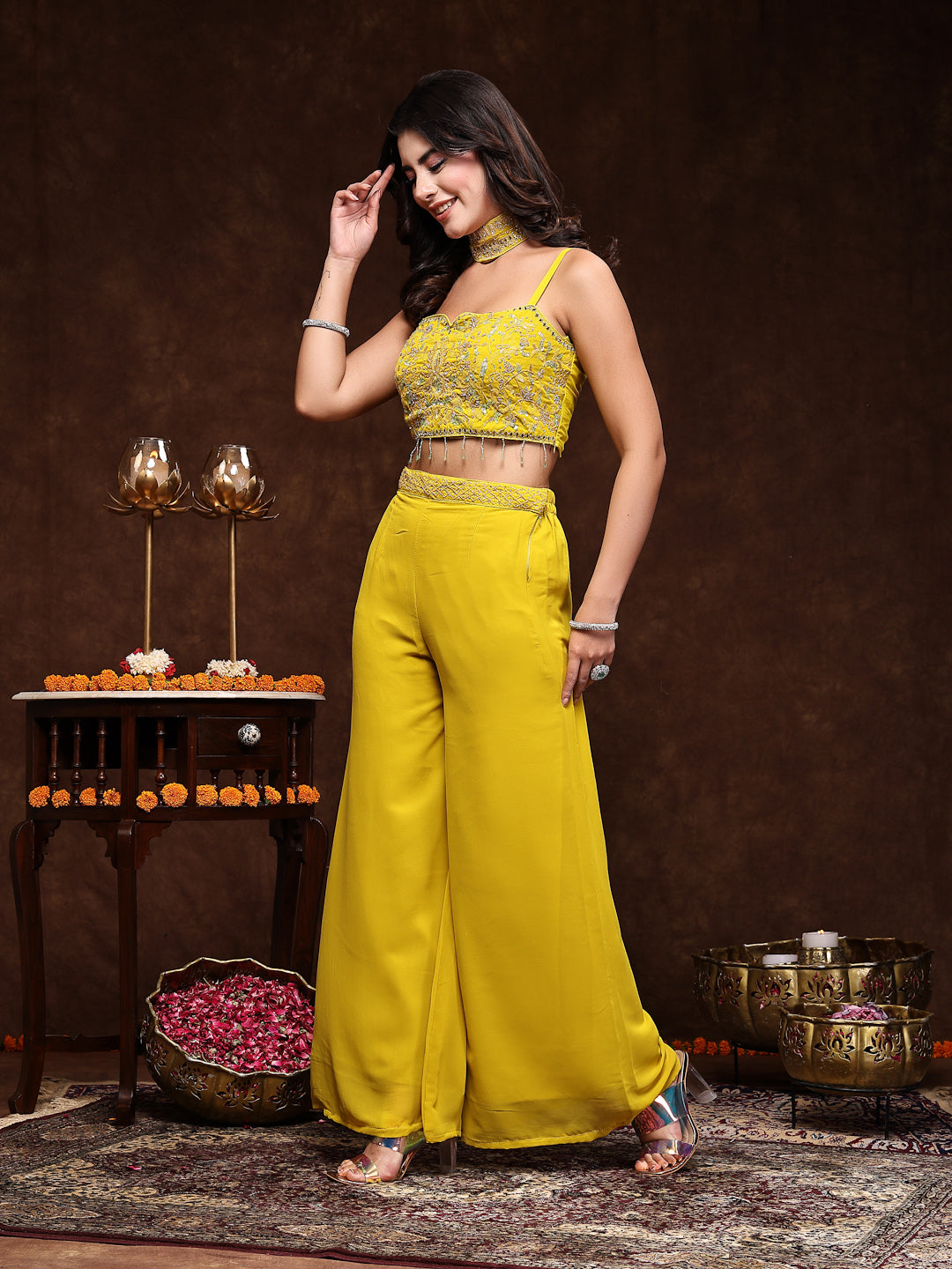 Mustard ethnic georgette solid palazzo with heavy embellished work blouse. This has jacket and sleeves fabric inside. Blouse Length - 15'' Palazzo Length - 38''.