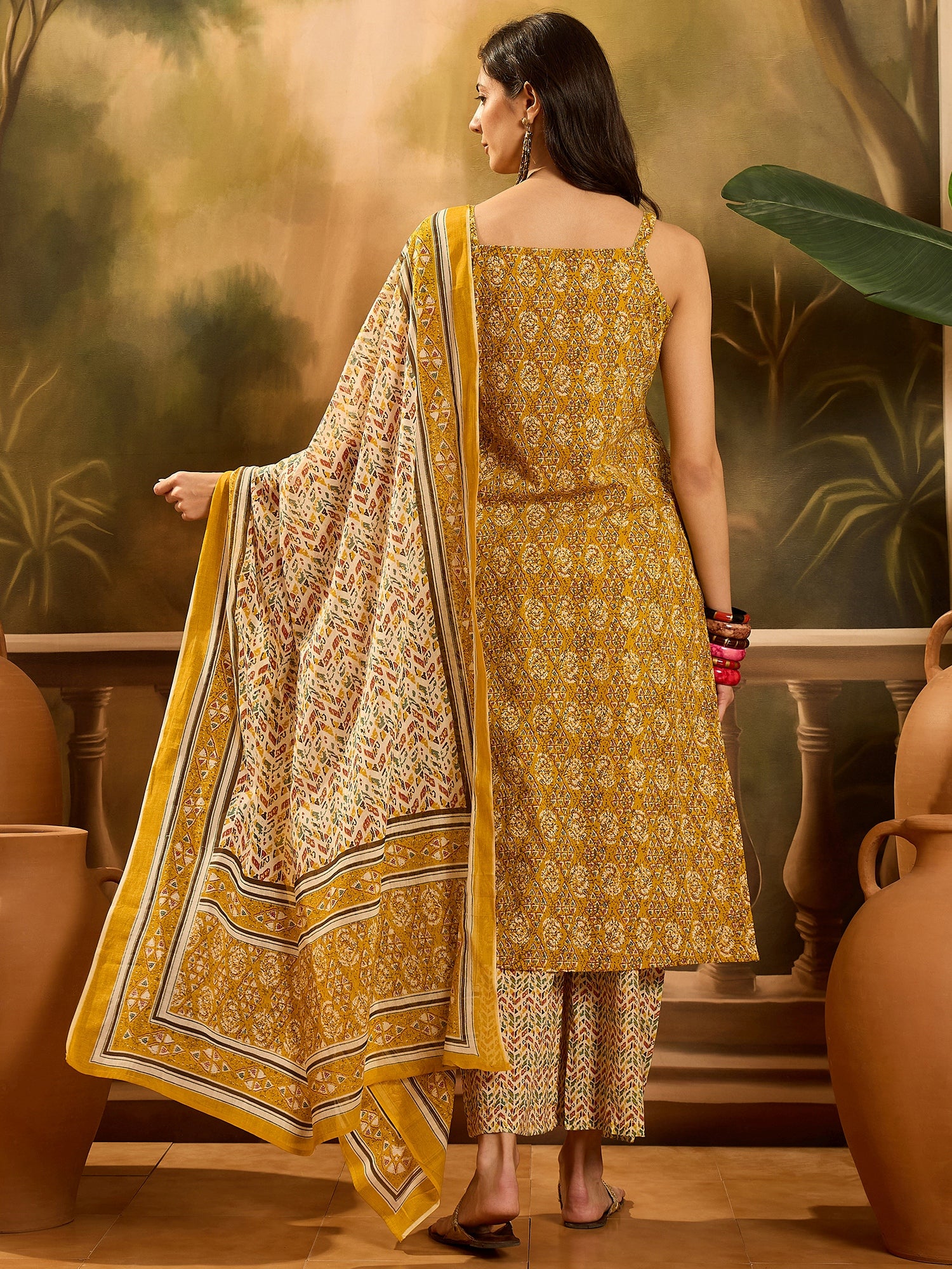 Stylum Women's Mustard Ethnic Motif Printed Cotton Straight Kurta Palazzo Dupatta Set (KPDMUSTARDMUMBA)