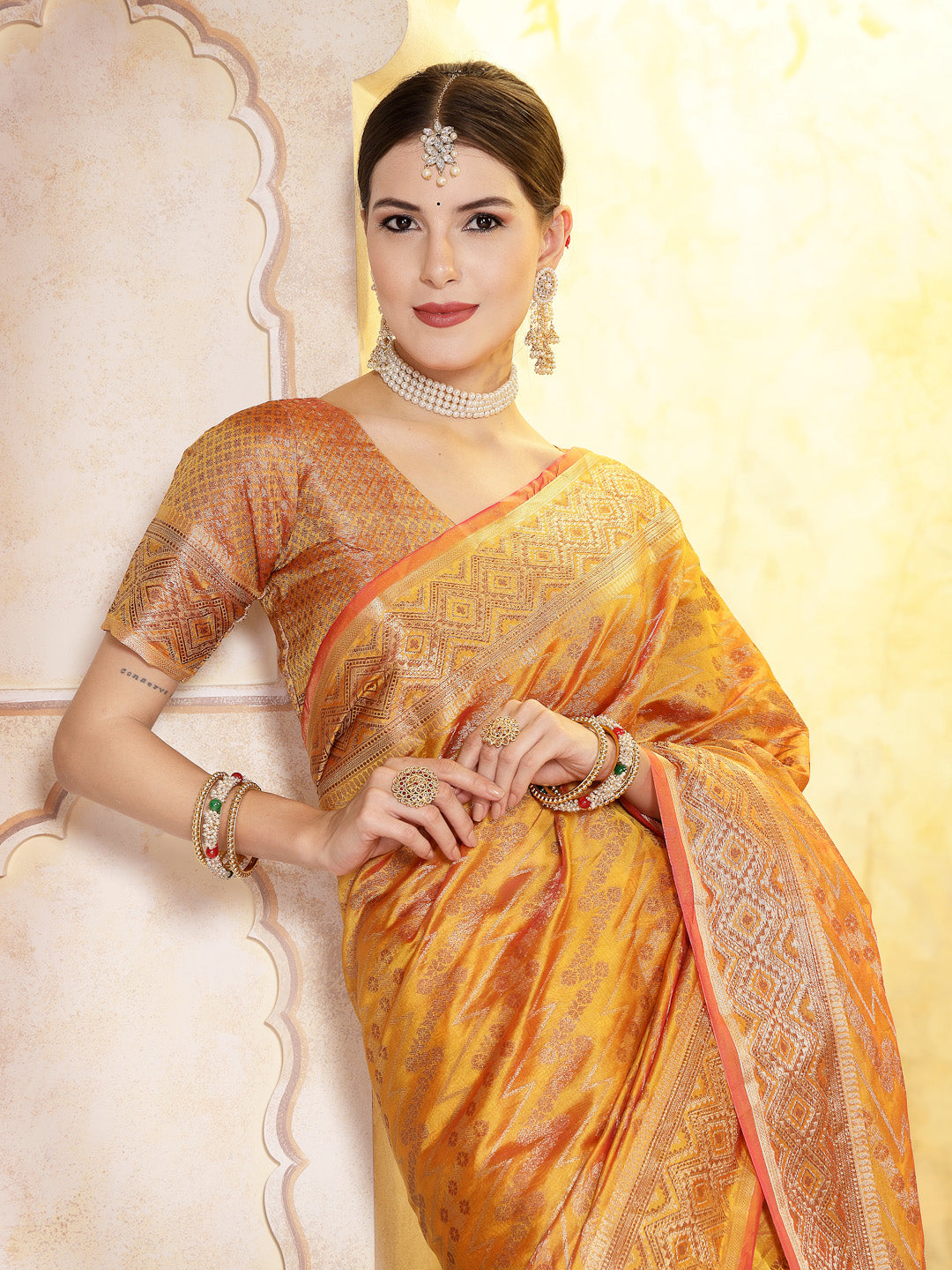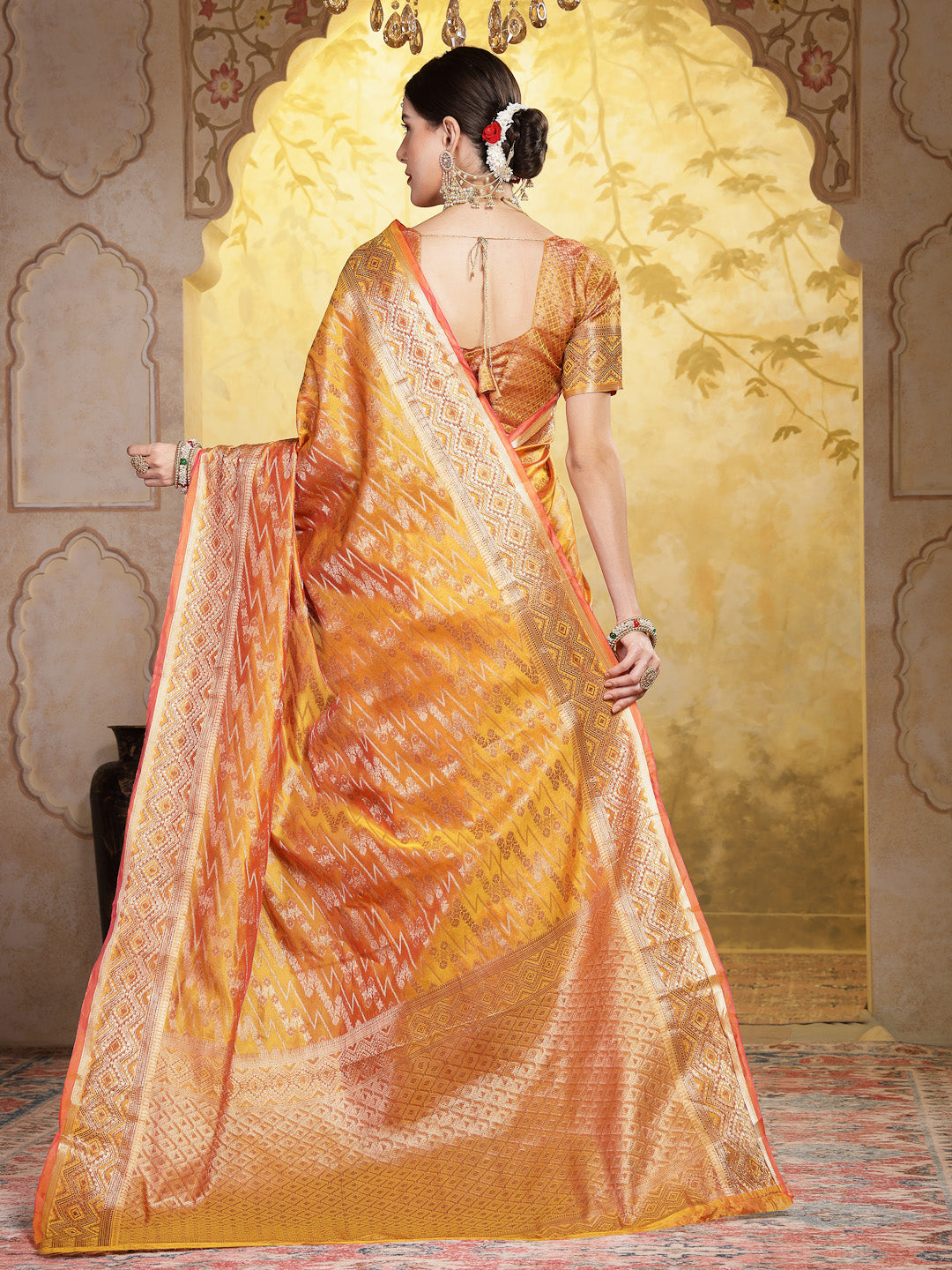 Mustard Banarsi Organza Saree. This Elegant Party wear Saree Is With Zari Border. Saree Length- 5.5 Mtr, Blouse piece lenght- 0.8 Mtr