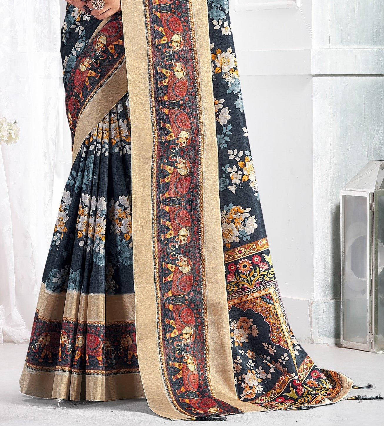 Navy floral printed silk saree. Floral saree is with digital border. The saree comes with an unstitched blouse piece. Saree Length- 5.5 Mtr, Blouse Piece Width- 1.05 Mtr, Blouse piece lenght- 0.8 Mtr