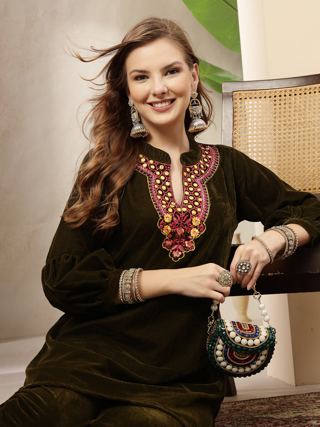 Olive solid velvet co-ords set with puff sleeves and embroidery yoke on it, solid pant has fully elasticated waistband. Pair it with beautiful accessories like earrings, flats to enchance the look. Product Kurta Length- 32" Inch, Pant Length- 38' Inch.