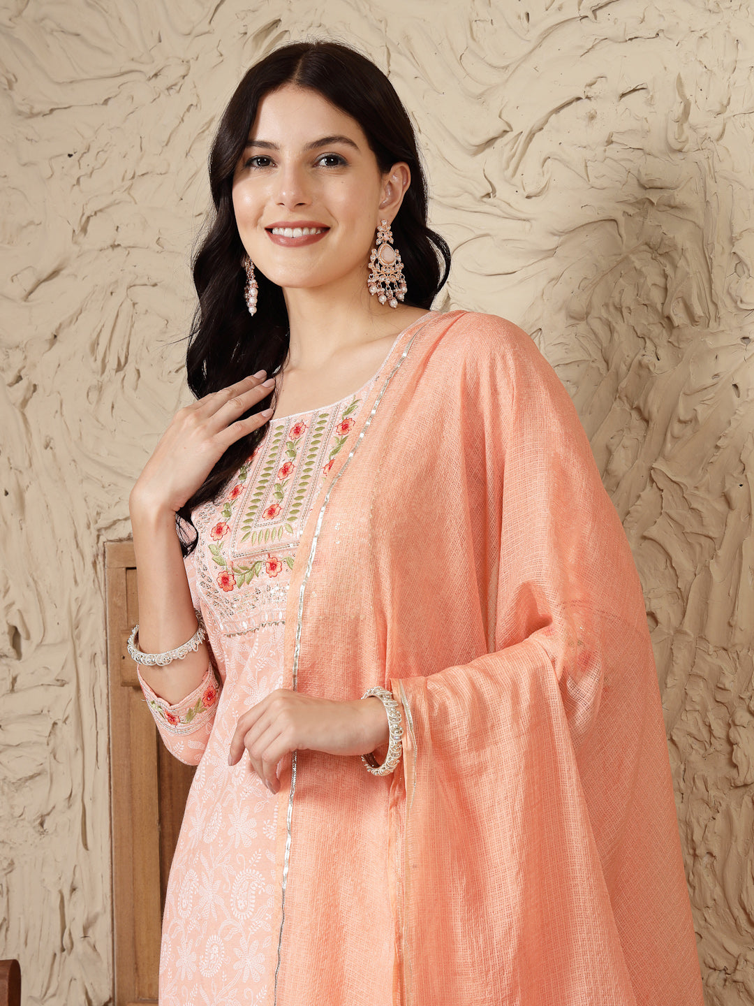 Pestal peach printed and embroidered straight kurta pant dupatta set. Kurta has embroidered yoke, with 3/4 sleeve. It has solid afghani pant and solid kota doriya  dupatta, Kurta Length- 45" Inch, Pant Length - 38'' Inch, Dupatta Length - 2.30 mtr.