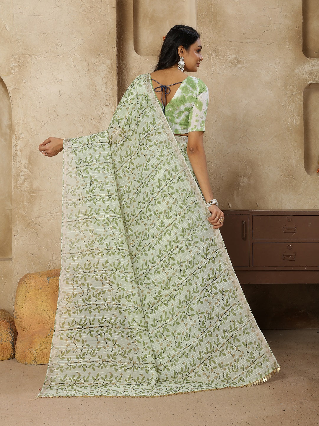 Stylum Women's Pestal Green Printed Zari Border Linen Saree with Fancy Blouse (SRROMANIYAGREEN)