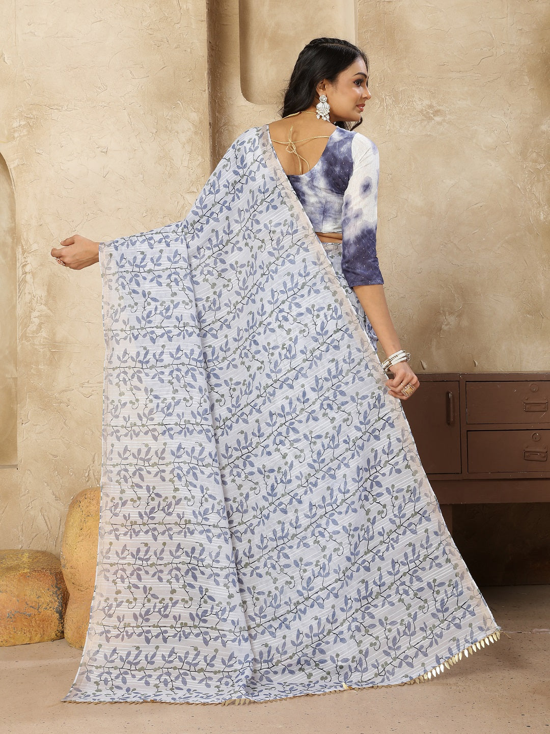 Stylum Women's Pestal Navy Printed Zari Border Linen Saree with Fancy Blouse (SRROMANIYANAVY)
