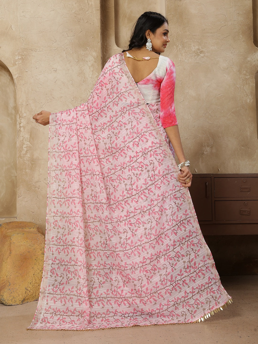 Stylum Women's Pestal Pink Printed Zari Border Linen Saree with Fancy Blouse (SRROMANIYAPINK)