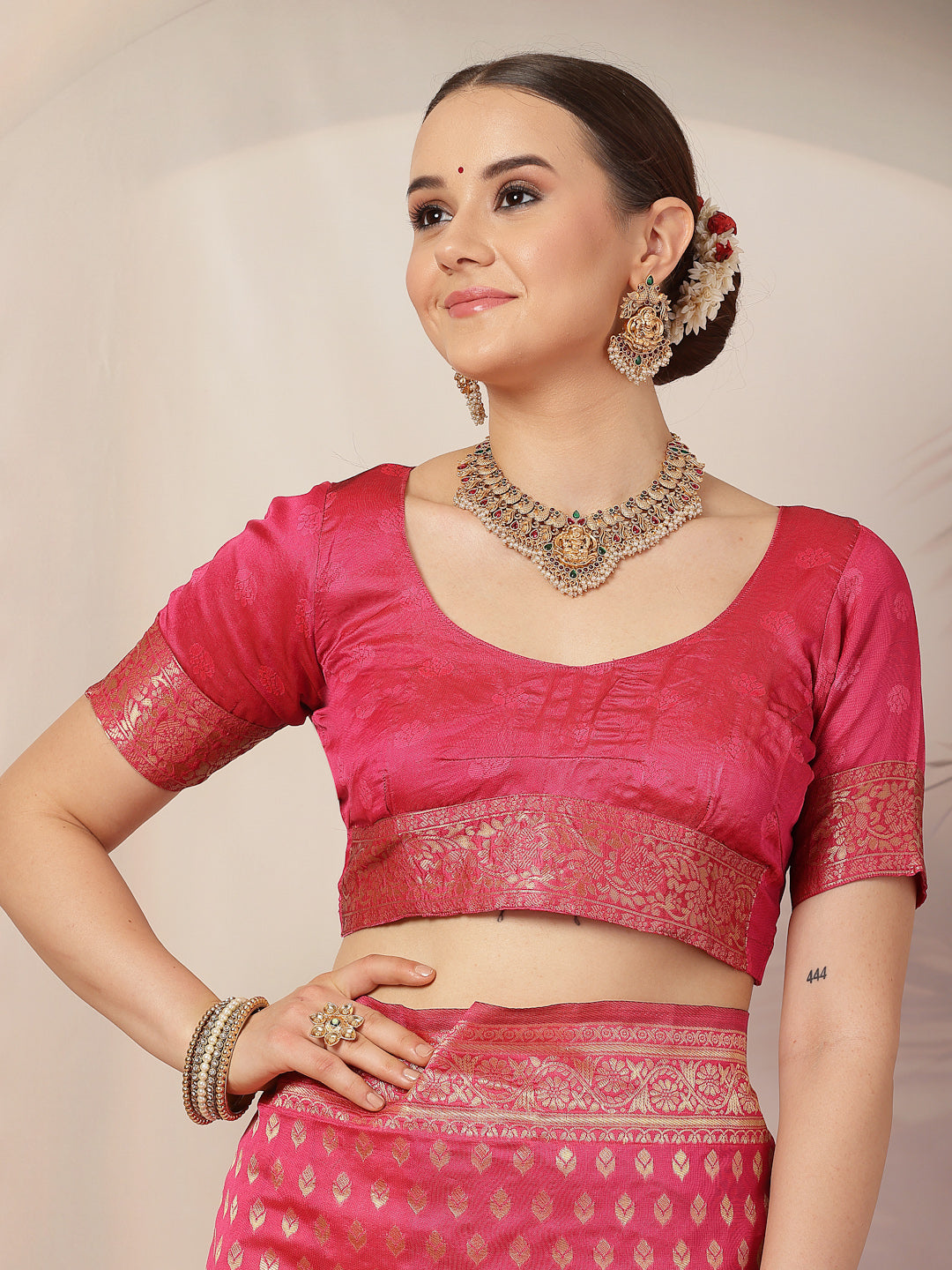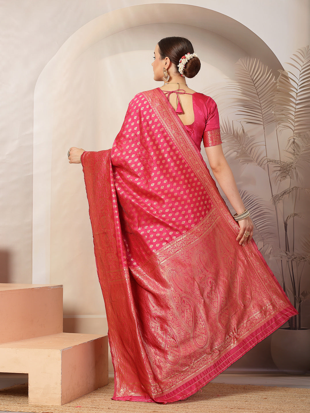 Pink traditional motifs banarsi saree. This elegant saree has woven zari border and unstiched blouse. Saree Length- 5.5 Mtr, Blouse Piece Lenght- 0.8 Mtr.