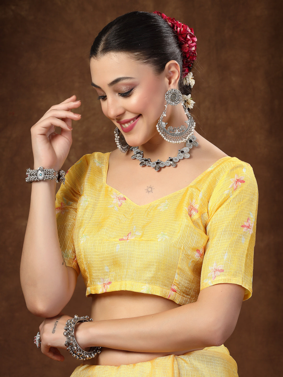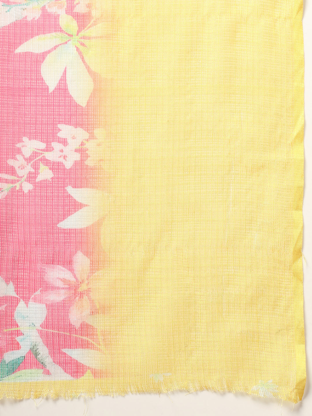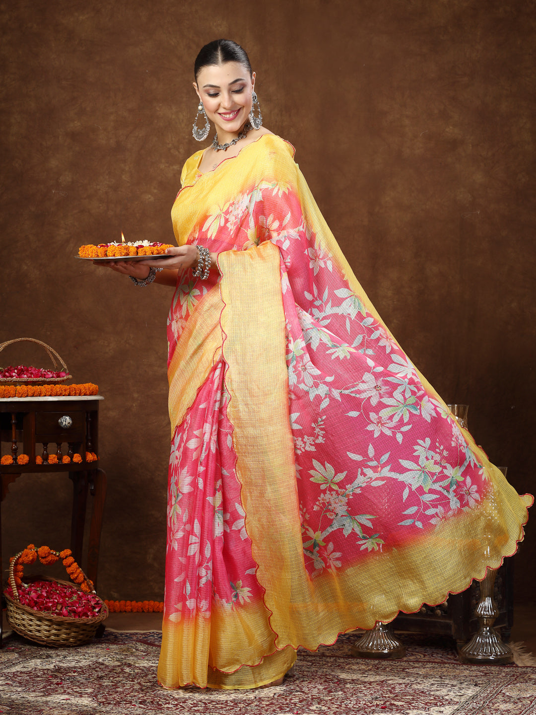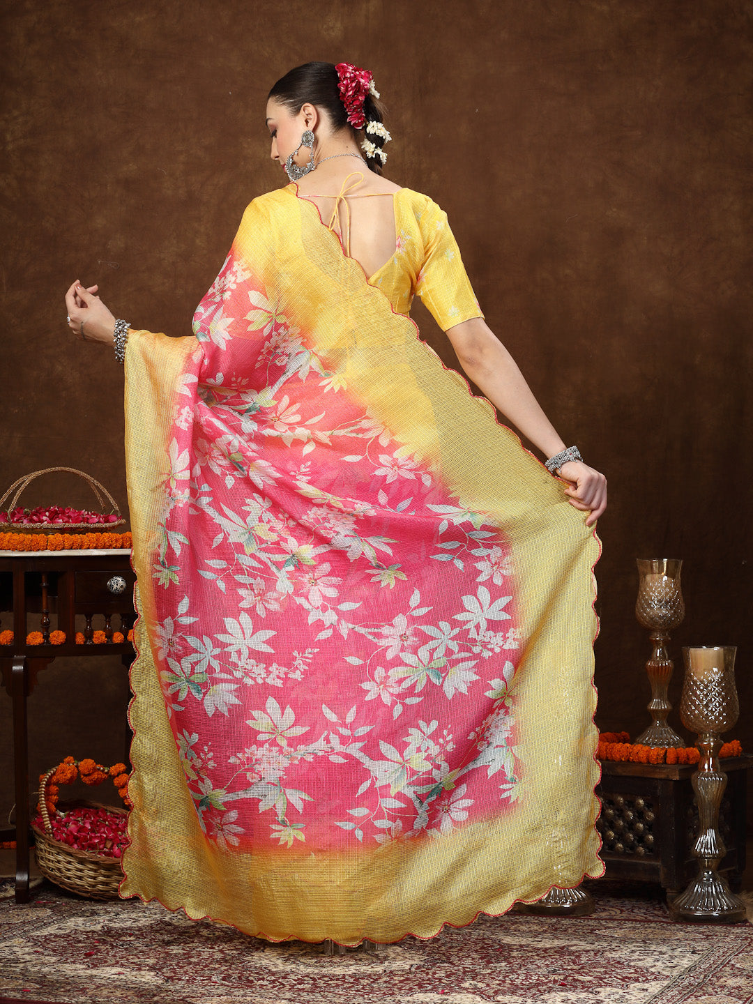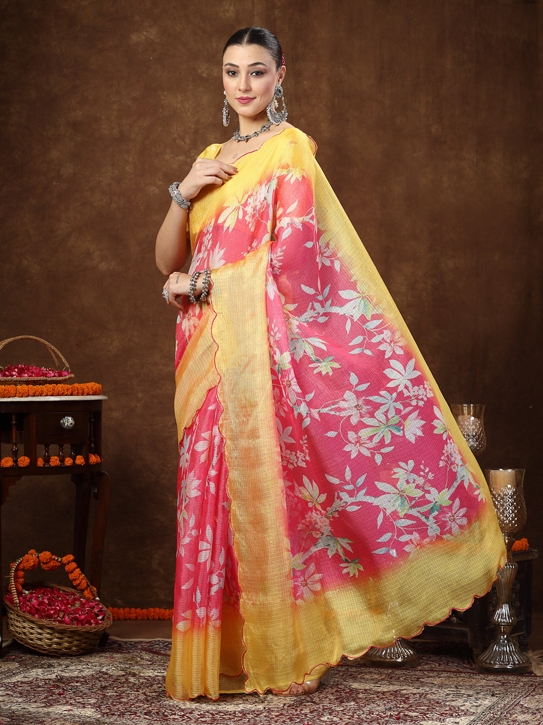 Pink ethnic floral printed supernet saree. This ethnic saree has cutting border. Saree has unstitched blouse. Length - 5.30 mtr, Blouse - .80 mtr
