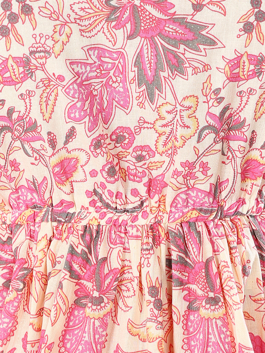 Cotton pink floral printed v-neck and shoulder tie-ups co-ord set. Comfy soft cotton mul fabric for summers. Top has tassles on it. Cotton blend lurex pant. Top Length- 25'' Inch, Pant Length- 38'' Inch.
