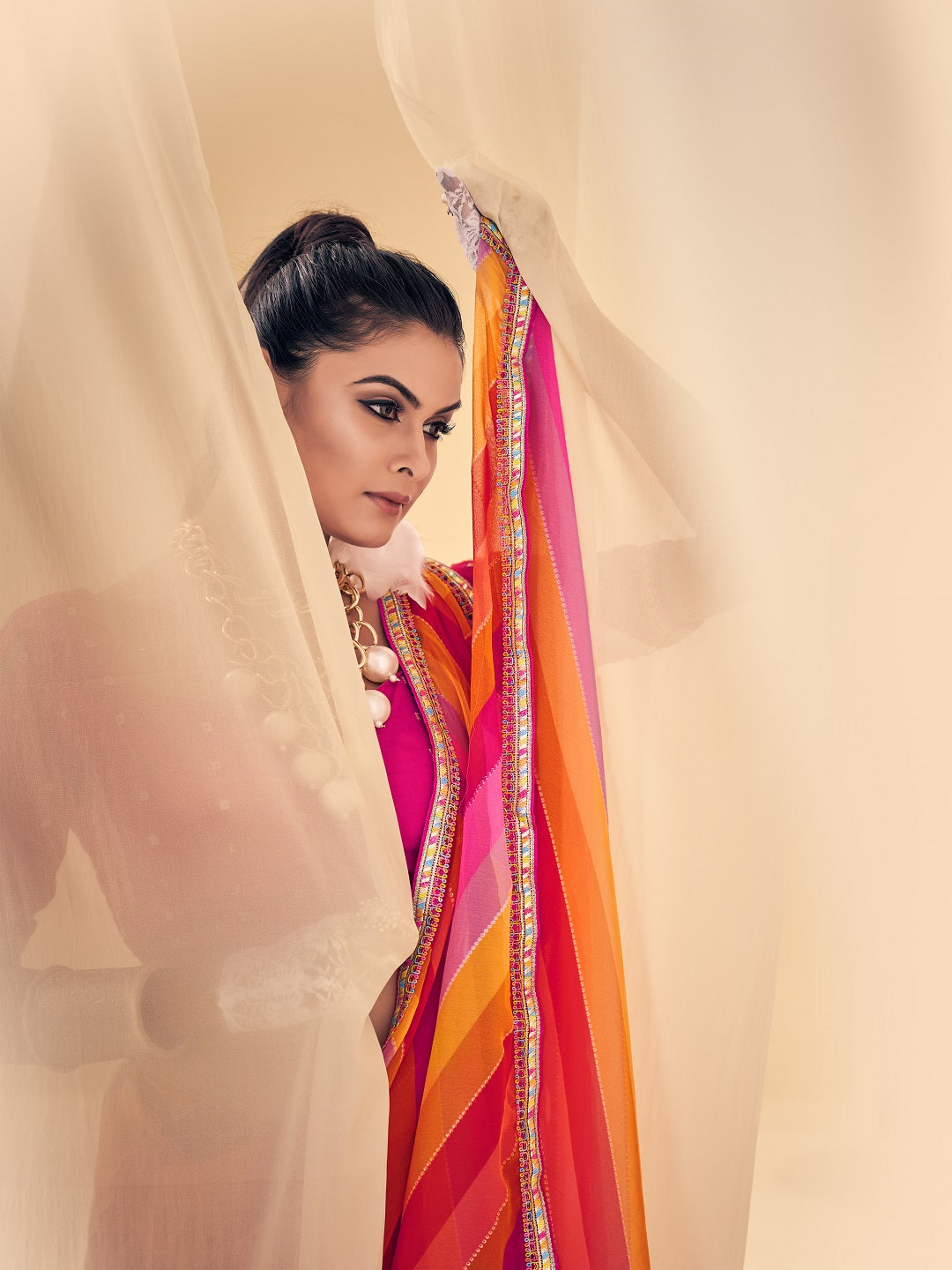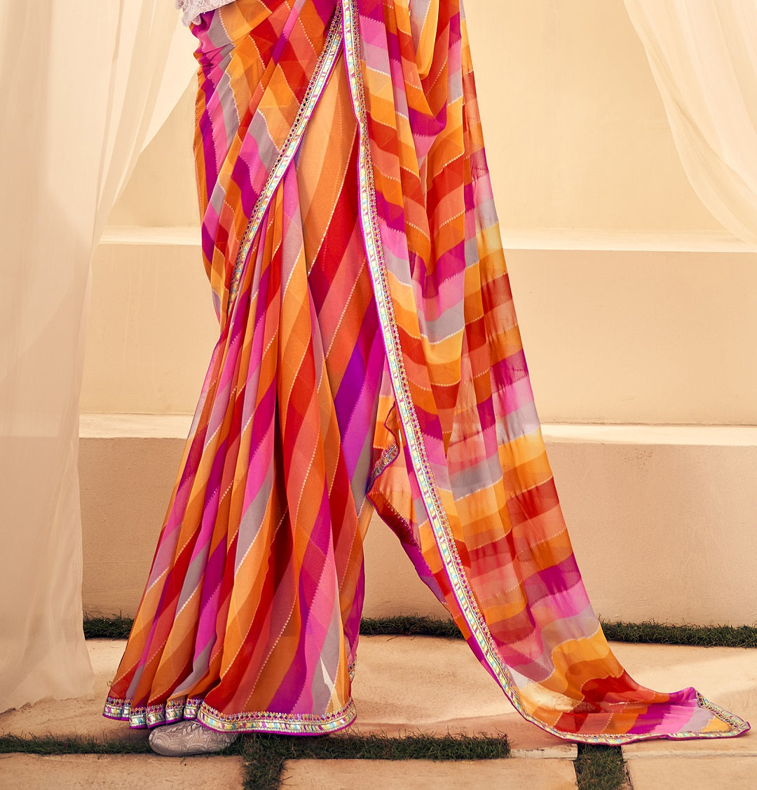 Pink Striped Bandhej Georgette Saree. This Traditional Saree Is With Multicolour Embroidered Border. Saree Length- 5.5 Mtr, Blouse piece lenght- 0.8 Mtr