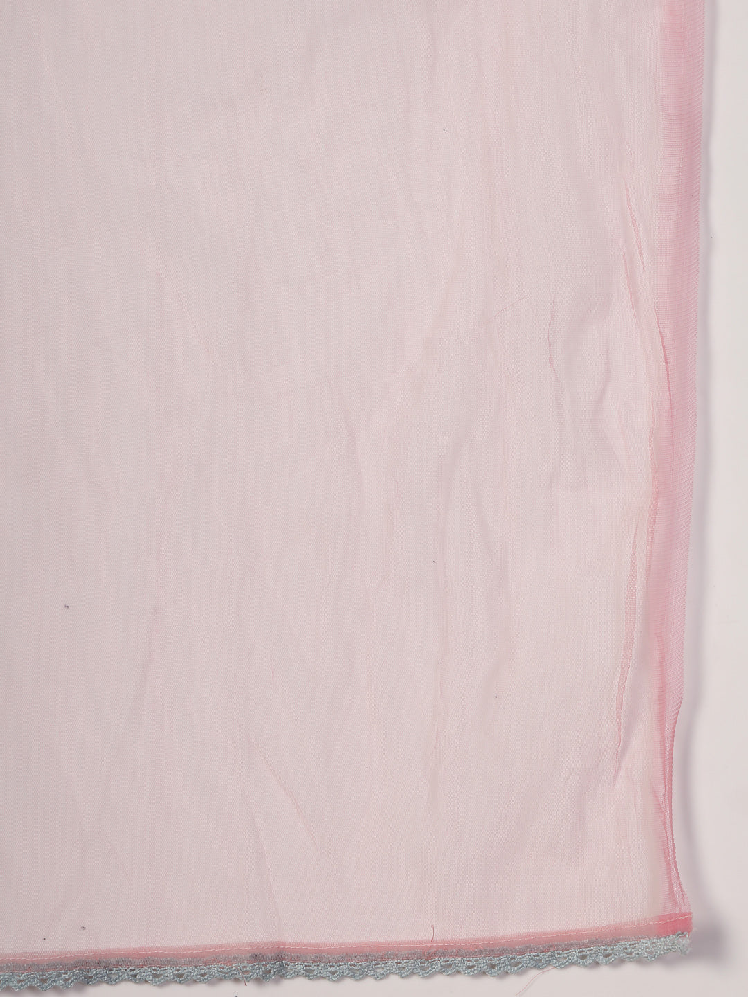 Festive pink soild kurta pant dupatta set in Italian crush fabric. Kurta has colourfull embroidered yoke. Border and laces on bottom and pant. Soild Pant is fully elasticated. Paired with lace detailed net fabric dupatta. Kurta Length- 45" Inch, Pant Length - 38'' Inch, Dupatta Length - 2.30 Mtr.