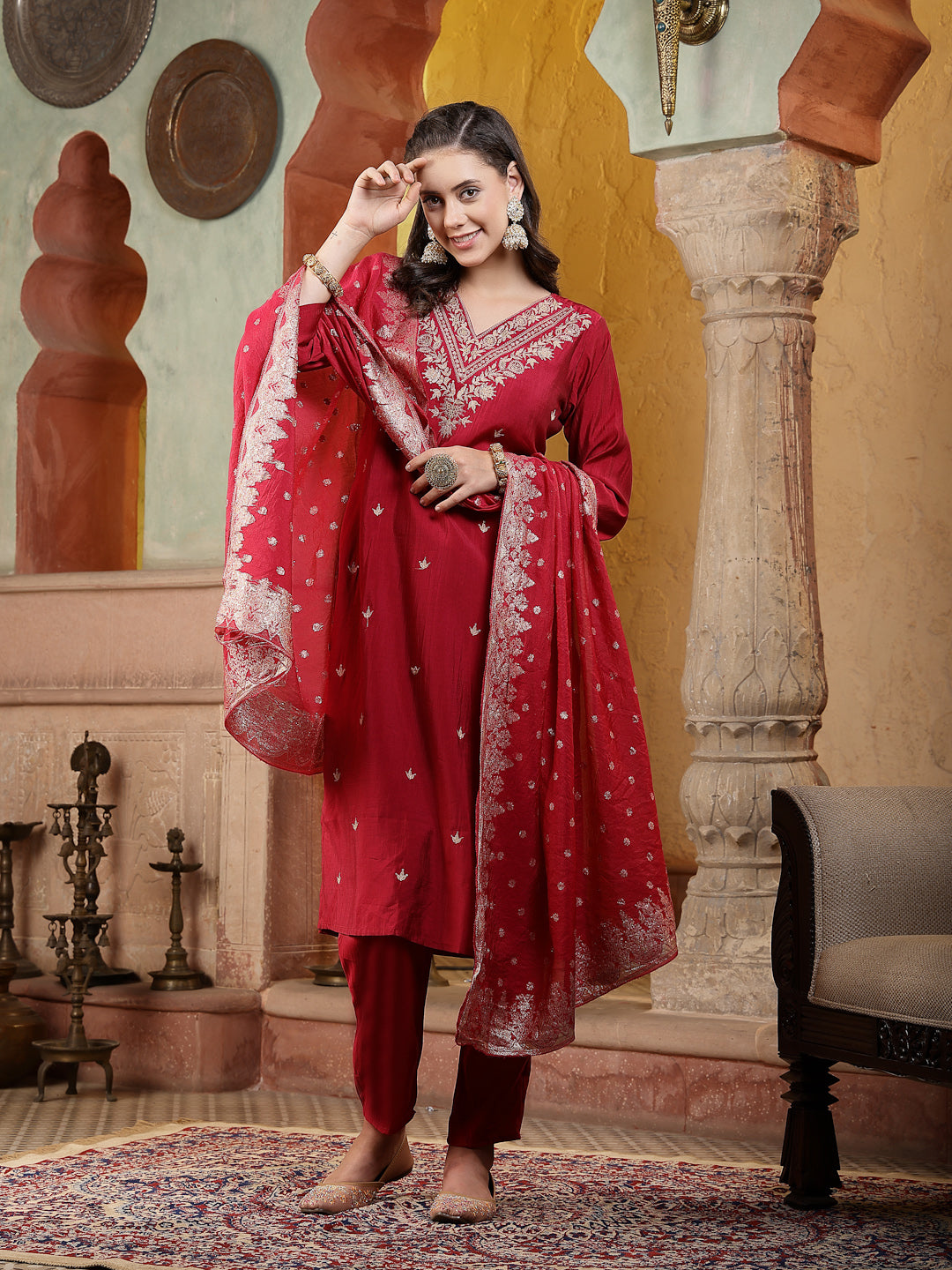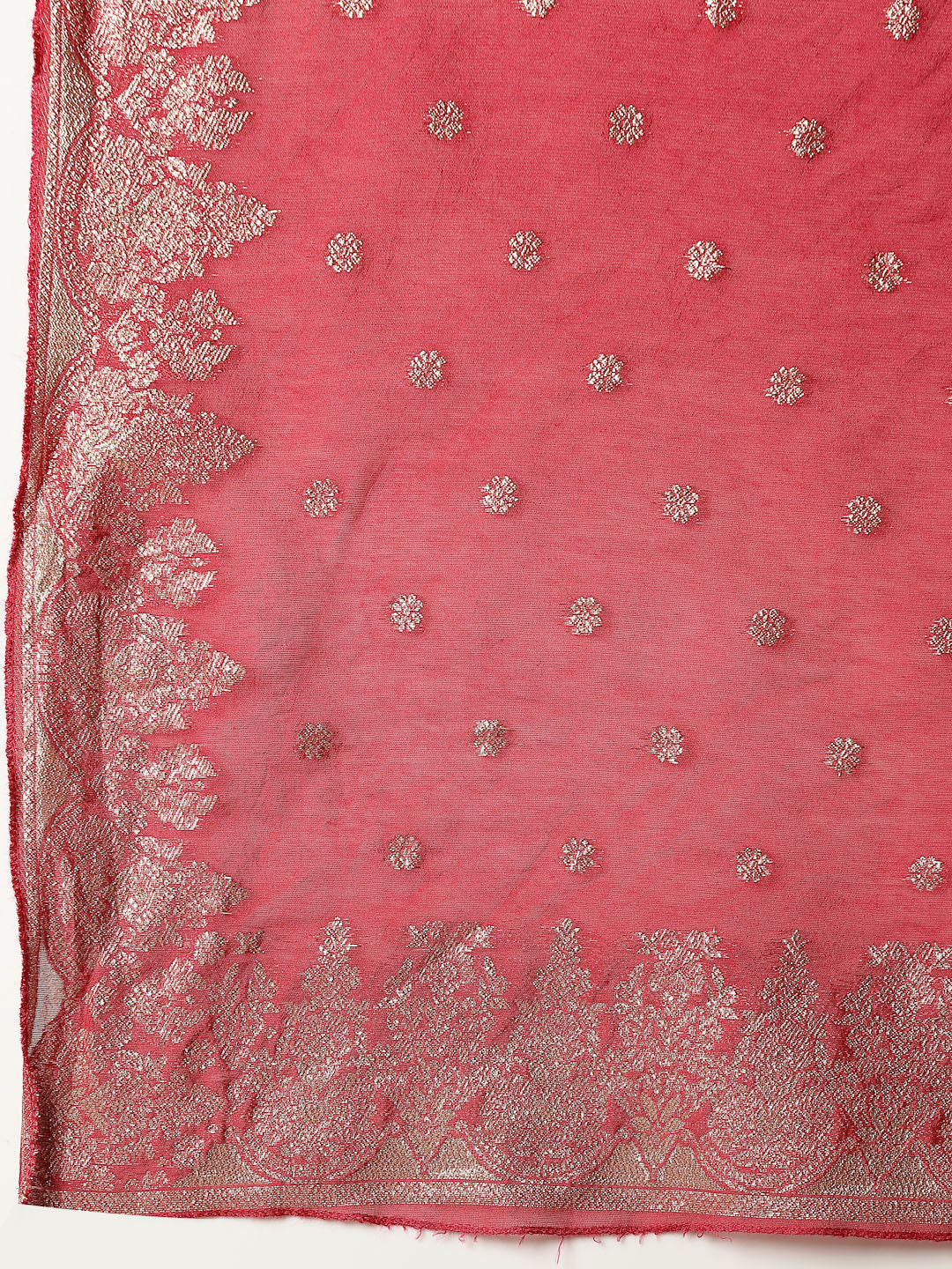 Stylum Women's Pink Solid & Embroidered Silk Blend Straight Kurta Pant Dupatta Set (KPDRANISUGAR)