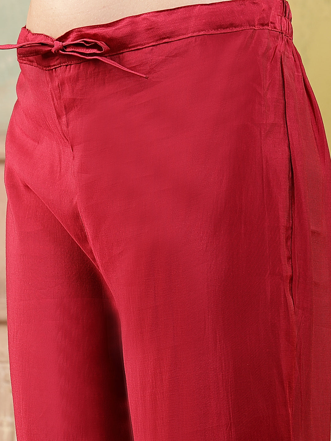 Festive pink solid embroidered silk blend kurta with pant and dupatta set. Kurta has beautiful embroidered v-neck line. Fully elasticated solid bottom. Paired with brocade dupatta. Kurta Length- 45" Inch, Pant Length - 38'' Inch, Dupatta Length - 2.30 mtr