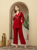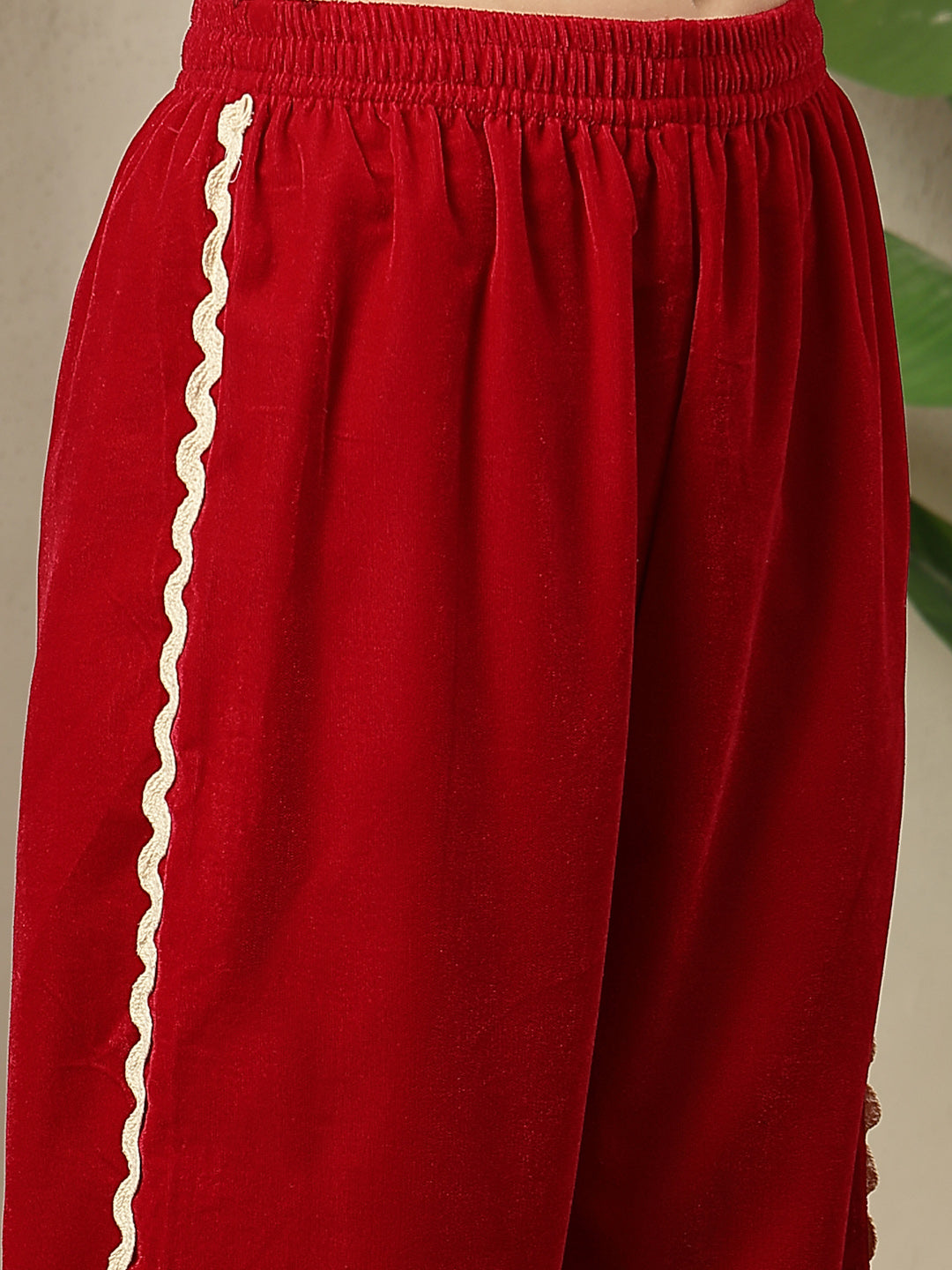 Pink solid velvet co-ord set. Top has coat collar with lace and button on it. Long sleeves with lace. Solid pink velvet pant with fully elasticated waist belt. Top Length- 30'' Inch, Pant Length- 38'' Inch.