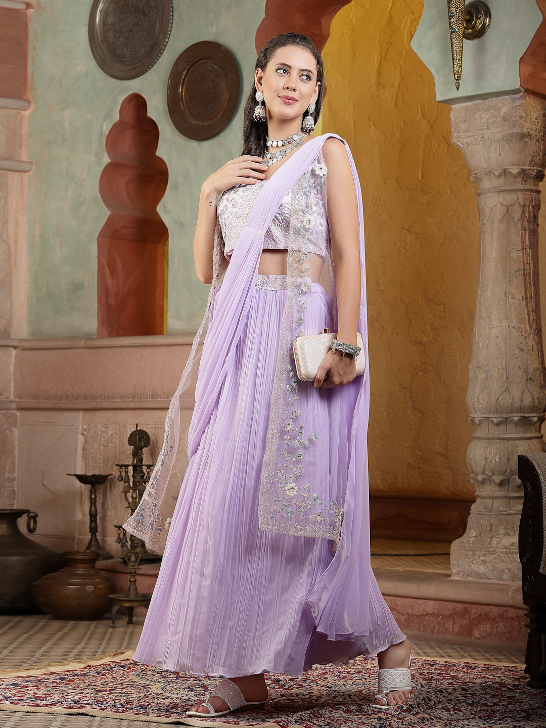 Lavender solid poly georgette draped lehenga, with sleeveless, round neck blouse it has it has intricate floral embroidery multicolor, net sleeveless long jacket with intricate embroidery. Lehenga length-42' Inch', blouse length-15'' Inch, Dupatta Length:- 2.70 Mtr..