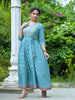 | Aqua bandhej printed rayon pleated ethnic dress with beautiful embroidery on yoke and lace detailing. Embellished fabric belt with gota phool on edges. Pair it with beautiful accessories like jhumkas, kadas and jutties to become for more graceful. Products Length- 52" Inch. |