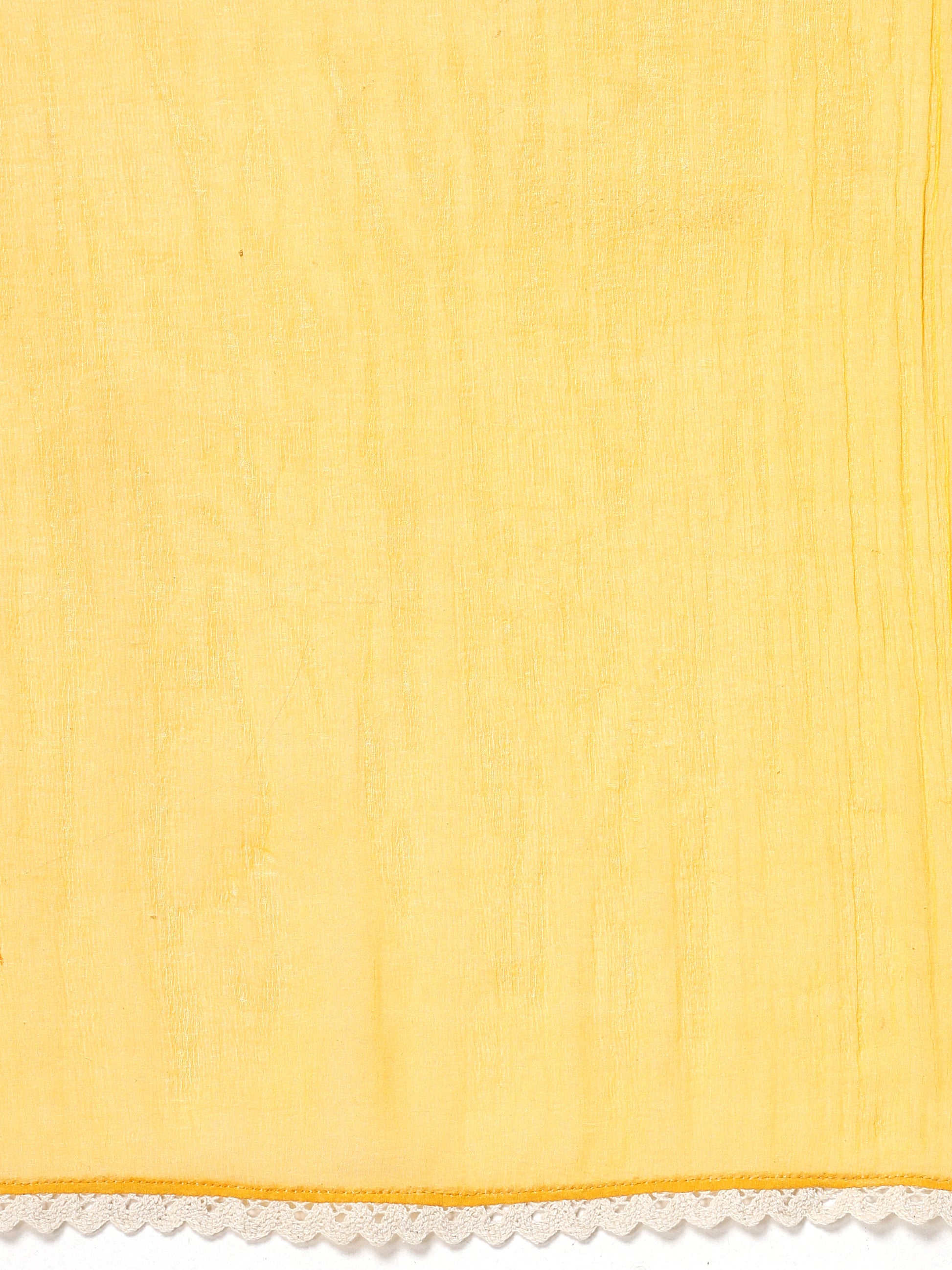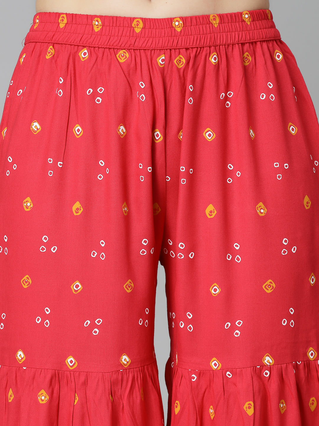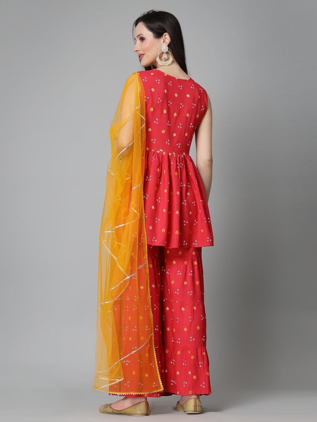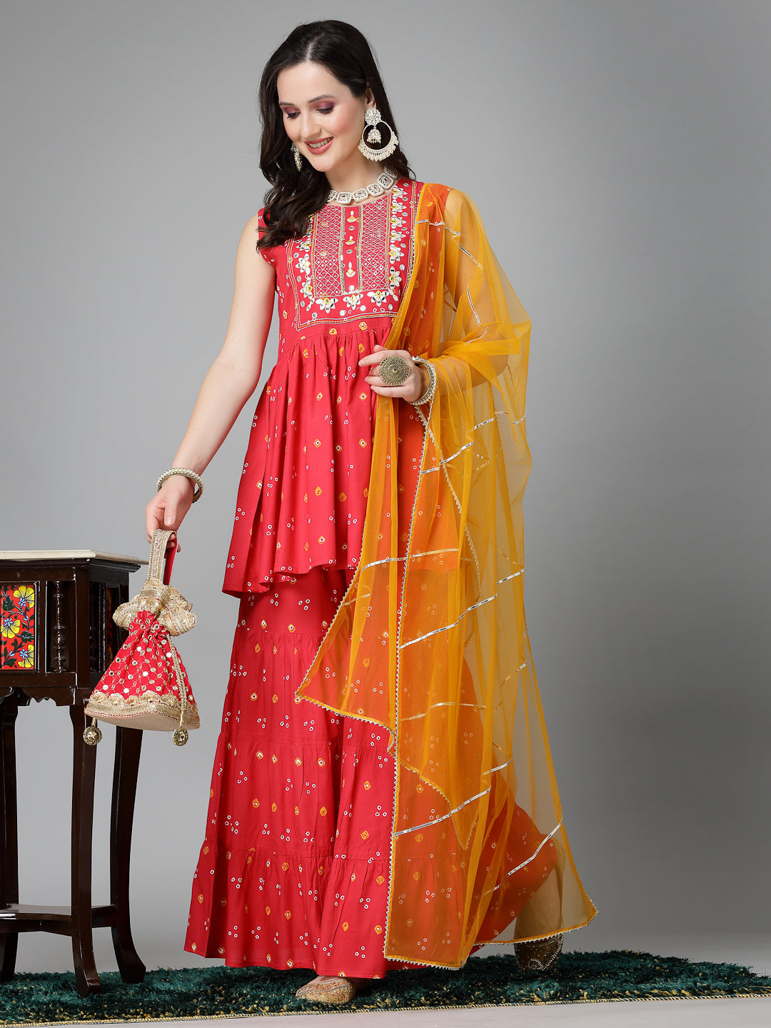 | Coral bandhej printed rayon short flared kurta with sequence embroidery, printed tiered sharara which has full elasticated waistband and net dupatta with lace taping. Pair it with beautiful accessories like jhumkas, kadas and jutties to become for more gracee. Products Length- 34" Inch, Sharara Length - 38" Inch, Dupatta Length- 2.35 Mtr. |