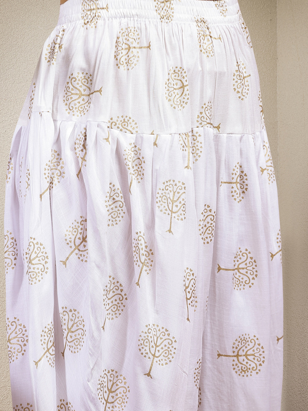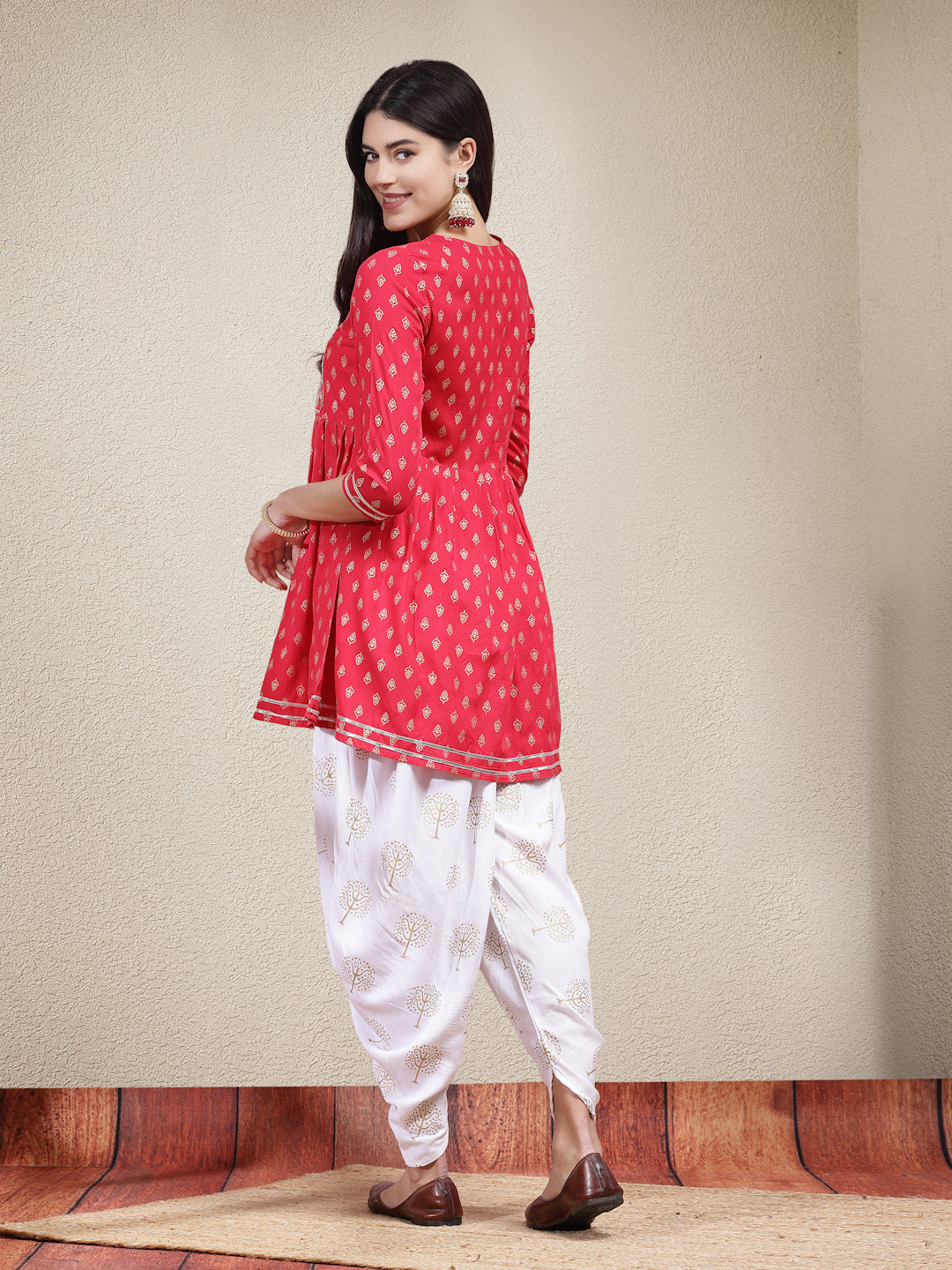 Pink ethinc motif gold printed kurti with embroidery on yoke and gota lace detailing and gold printed dhoti pant which has full elasticated waistband. Pair it with stunningÃÂ jewellery and jutties to flaunt yourself. Products Kurta Length - 34" inch and Dhoti Length - 38" Inch.