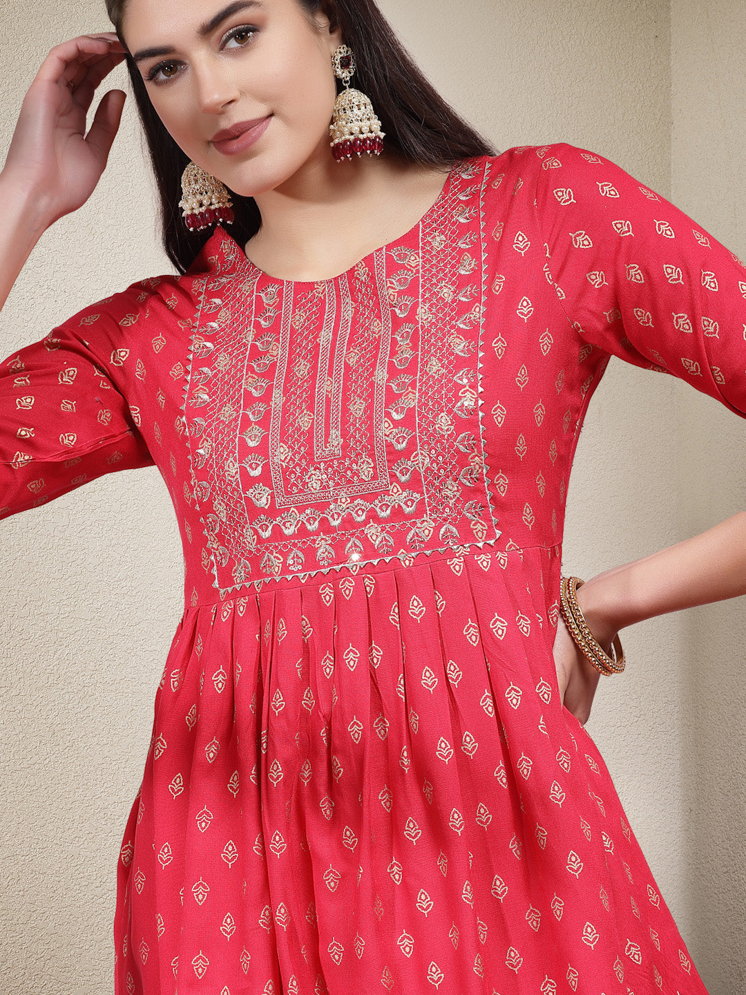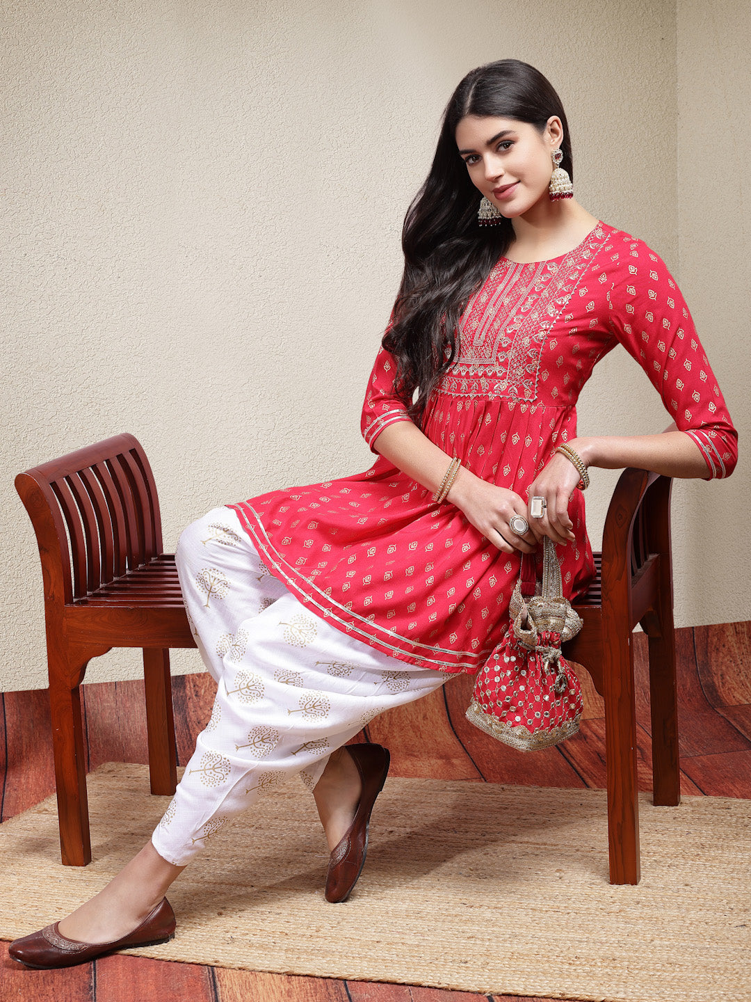 Stylum Women's Printed & Embroidered Rayon Kurti with Dhoti Pant (KDPINKMAHI)