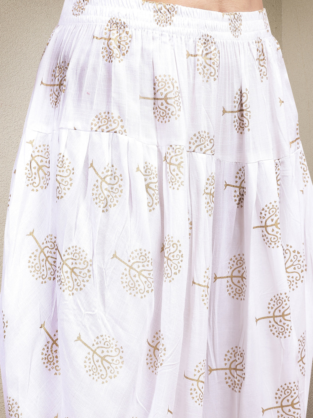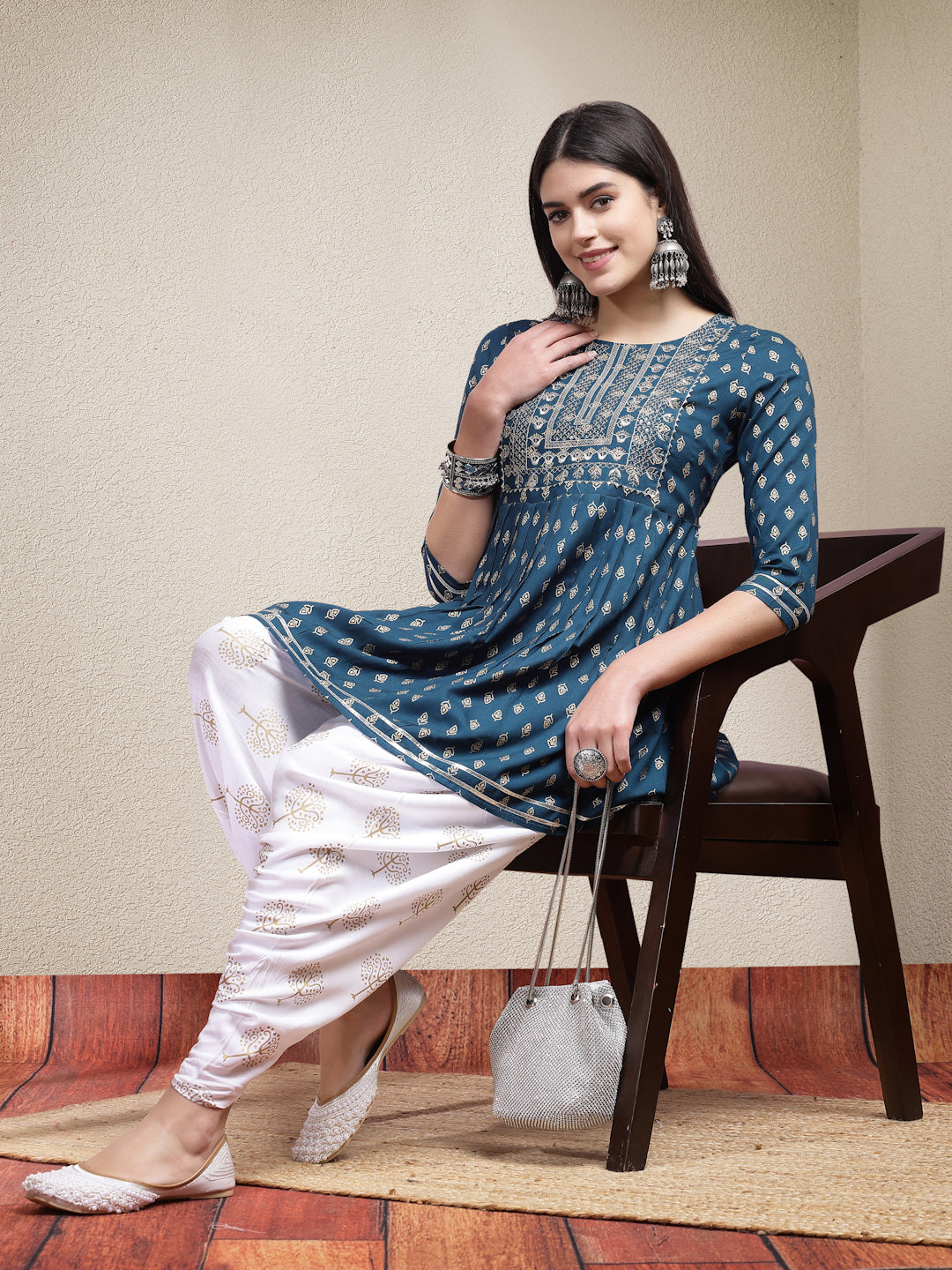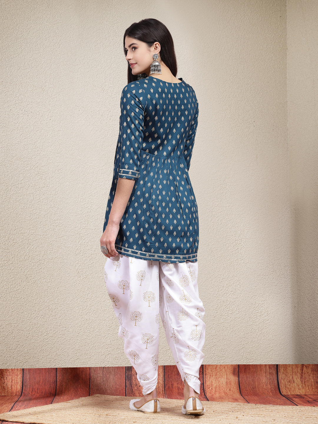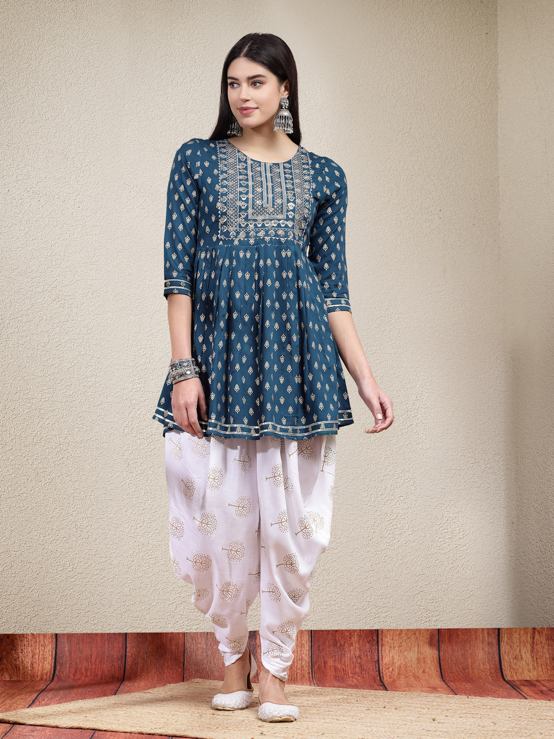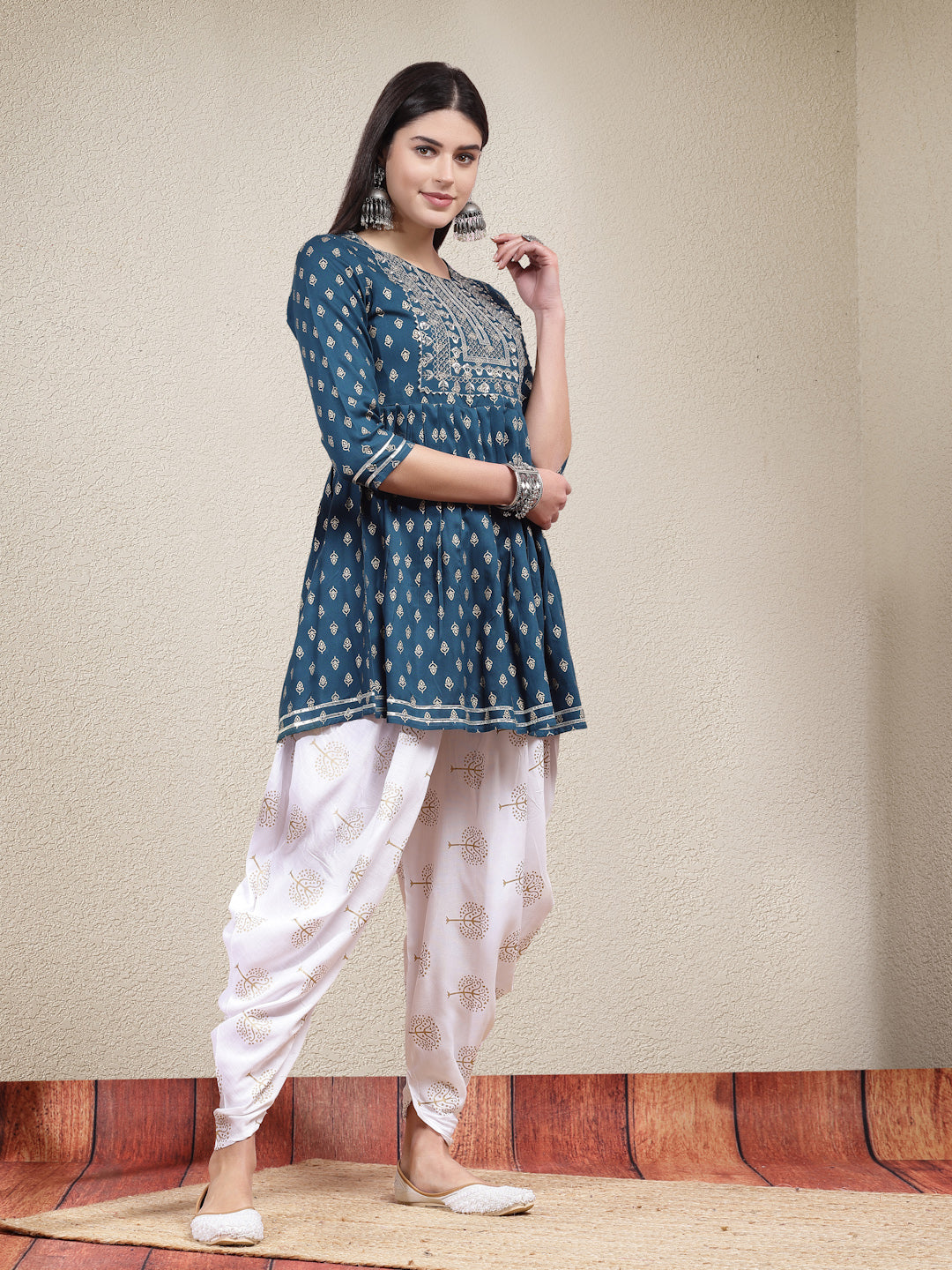 Stylum Women's Printed & Embroidered Rayon Kurti with Dhoti Pant (KDTEALMAHI)