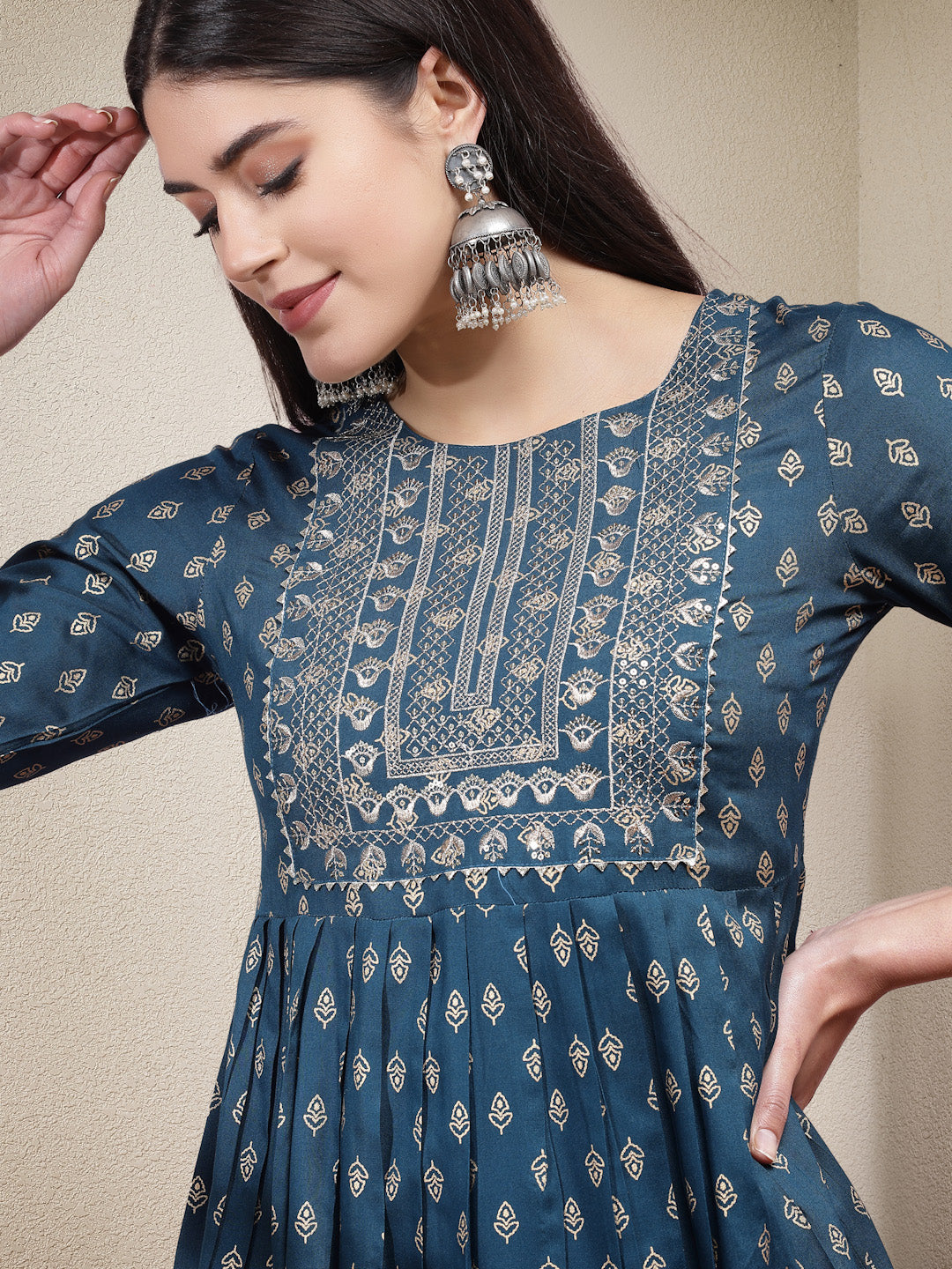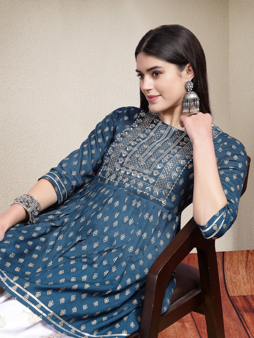 Teal Blue ethinc motif gold printed kurti with embroidery on yoke and gota lace detailing and gold printed dhoti pant which has full elasticated waistband. Pair it with stunning jewellery and jutties to flaunt yourself. Products Kurta Length - 34" inch and Dhoti Length - 38" Inch.