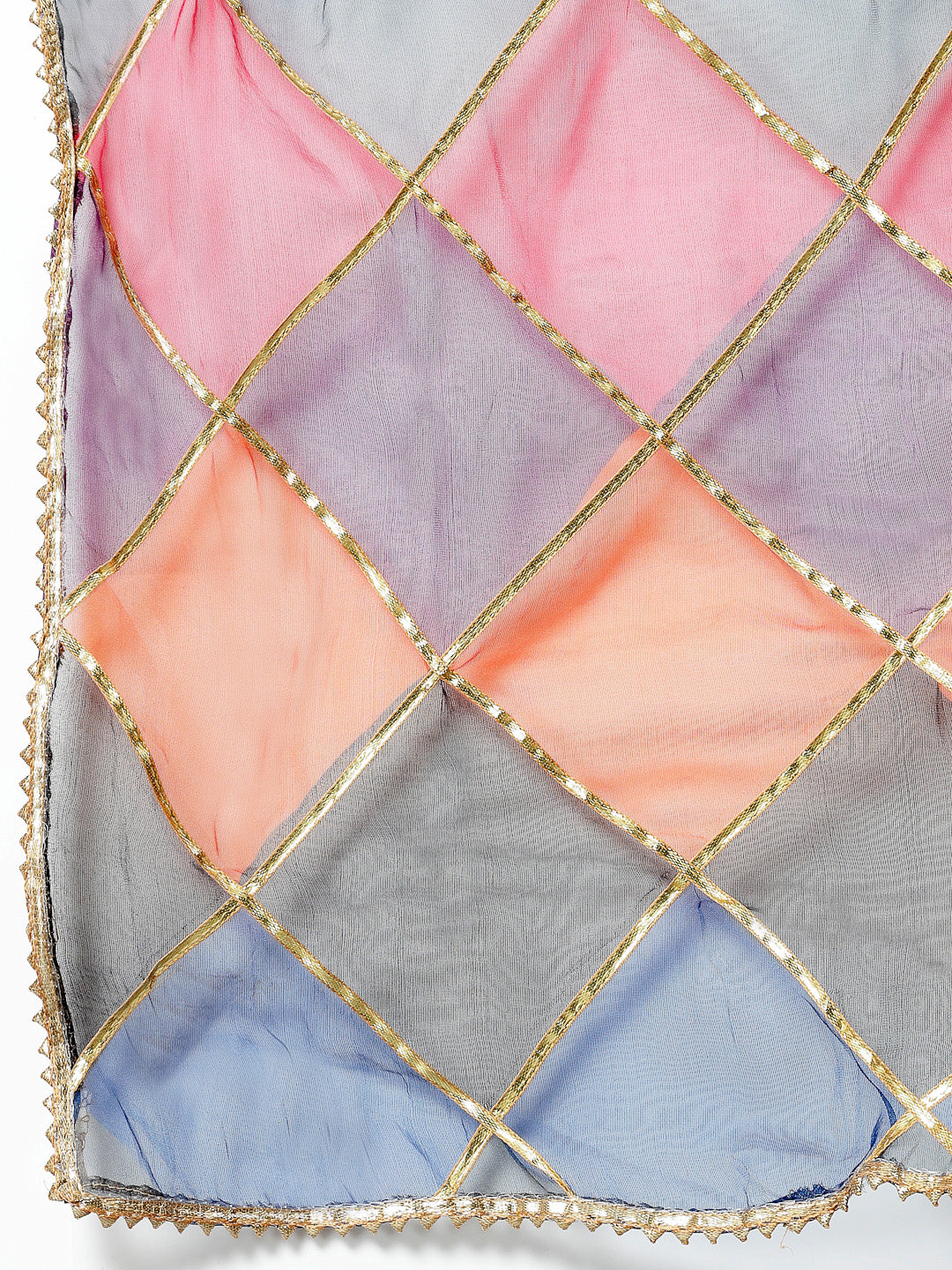 Multi colour block organza dupatta. Gota lace work all over the dupatta and bijiya lace on edges. Pair it with kurti or tunic and mojaris for a charming appeal. Dupatta length - 2.30mtr.