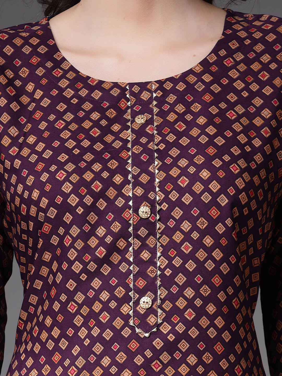 Purple Printed Poly Crepe Printed Straight Kurta palazzo set. Round Neckline and Front Placket With Buttons and Lace. Palazzo Has Elasticated Waistband. Kurta Length- 45" Inch, Pant Length- 38" Inch. Casual Wear Kurta Set.