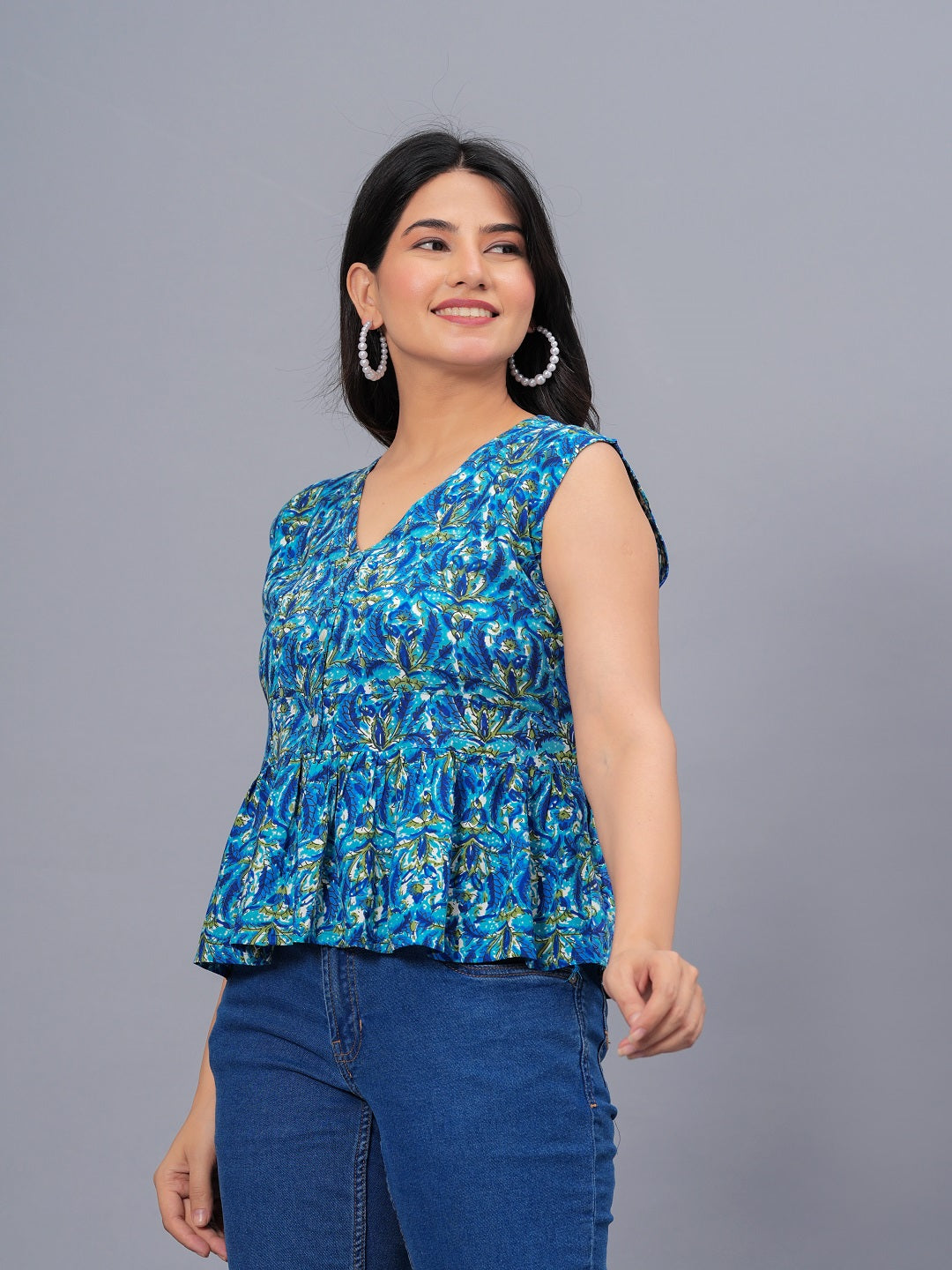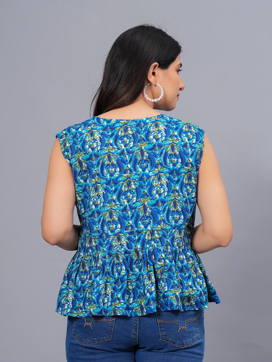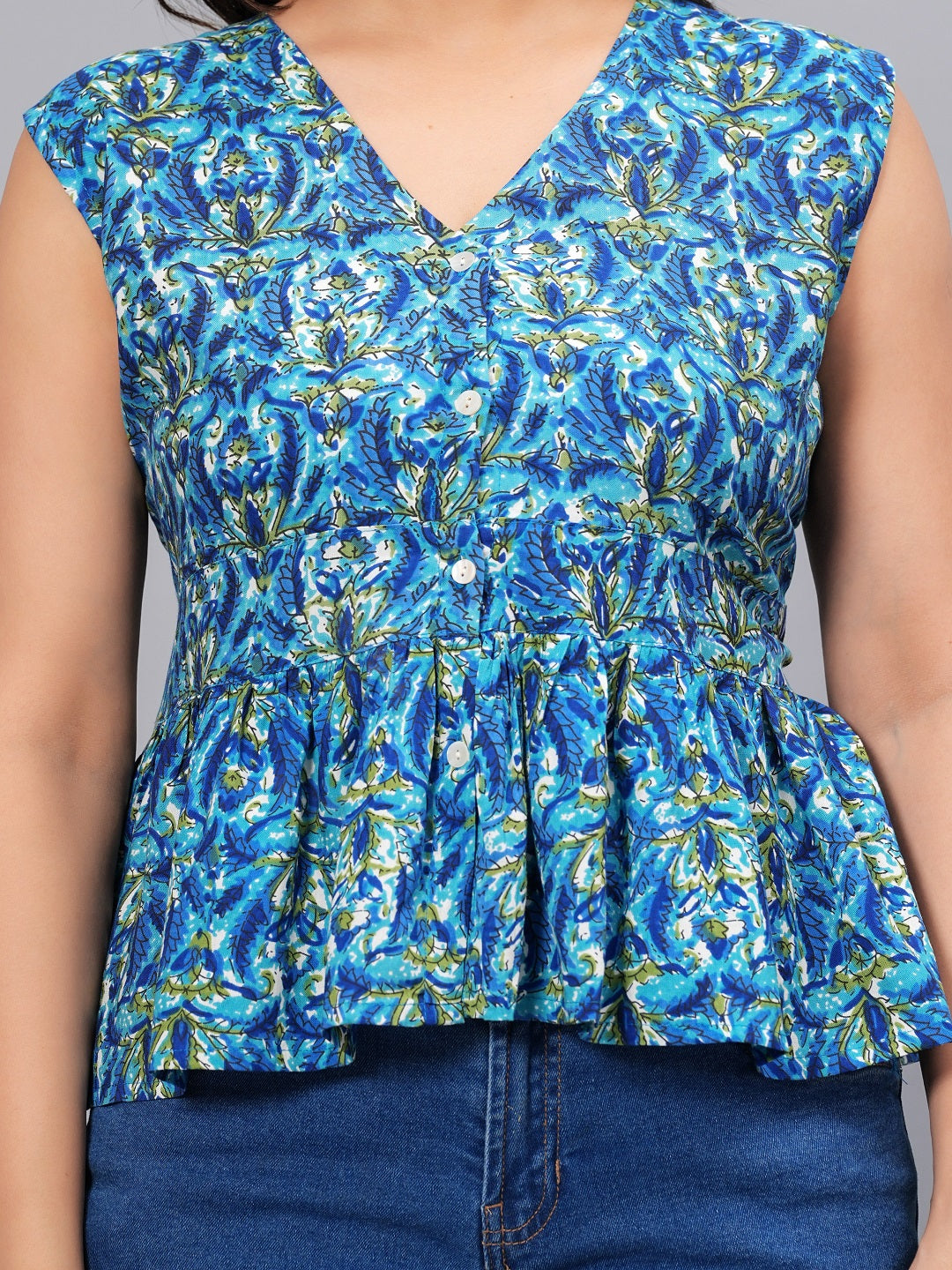 Blue printed V- neck peplum top. Front Functional Placket with shell button. Sleeve less top with belt detailing on waist. Top length - 20'', Casula wear top.Â