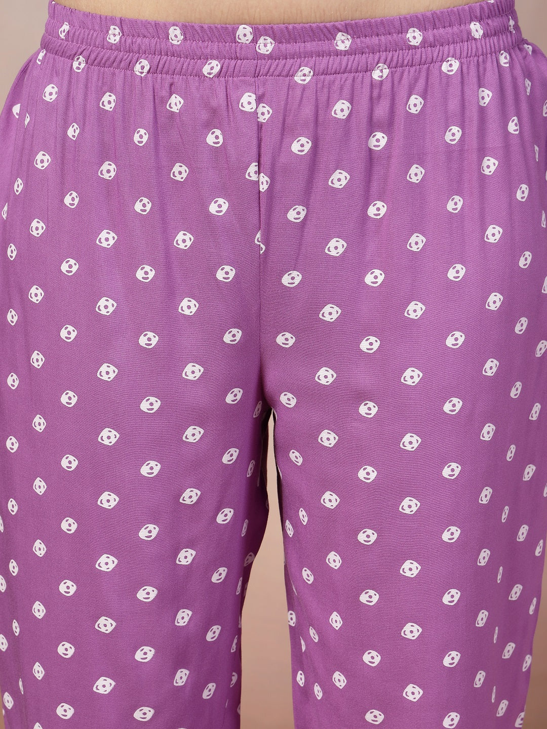 Stylum Women's Purple Bandhej Printed Rayon Flared Kurta Pant Dupatta Set (KPDPURPLEALIA)