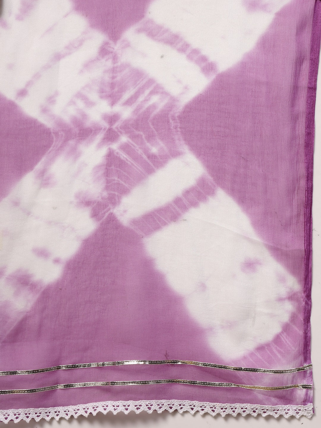 Purple rayon bandhni printed flared kurta pant dupatta. Kurta has beautiful thread and sequin embroidery yoke and border with lace detailing on it. Printed bottom and chiffon tie and dye dupatta, Kurta Length- 46" Inch, Pant Length - 38'' Inch, Dupatta Length - 2.30 mtr
