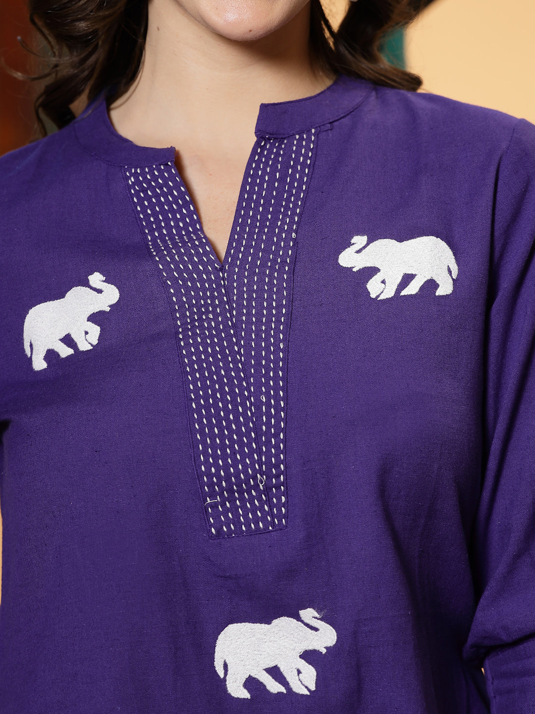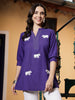 Purple cotton flex embroidered top. Top has animal embroidery on front and mandarin collar with cuffed sleeves. Top Length- 30" Inch.
