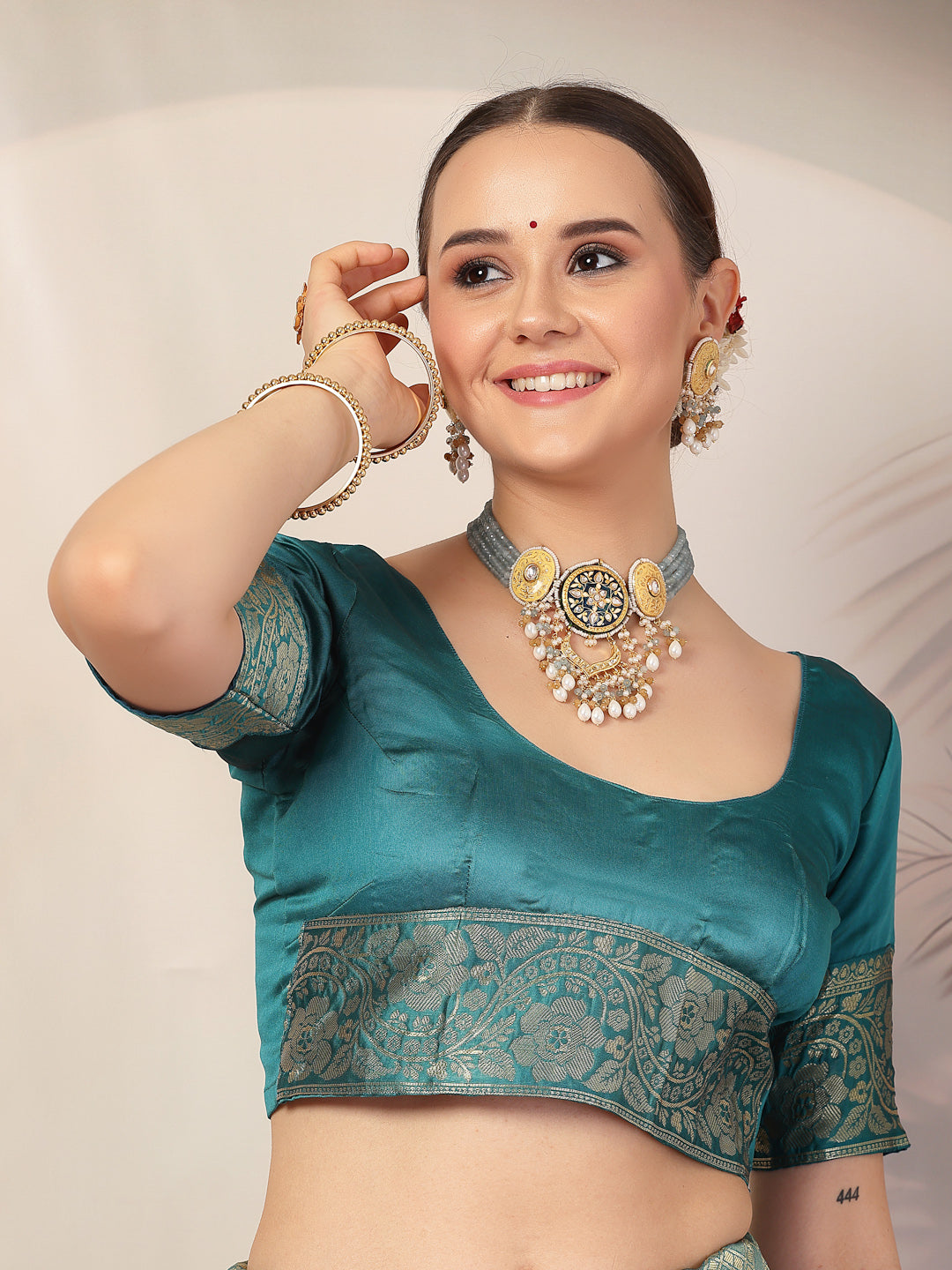 Rama green traditional motifs banarsi saree. This elegant saree has woven zari border and unstiched blouse. Saree Length- 5.5 Mtr, Blouse Piece Lenght- 0.8 Mtr.