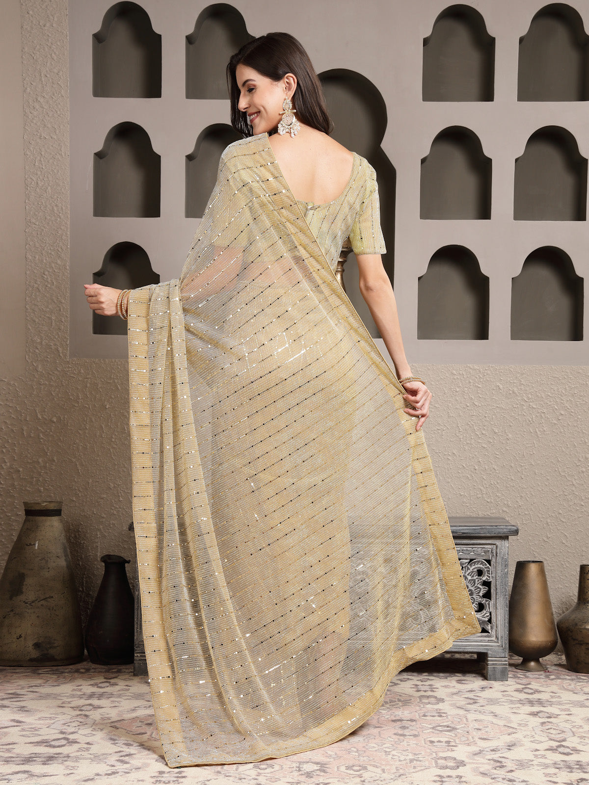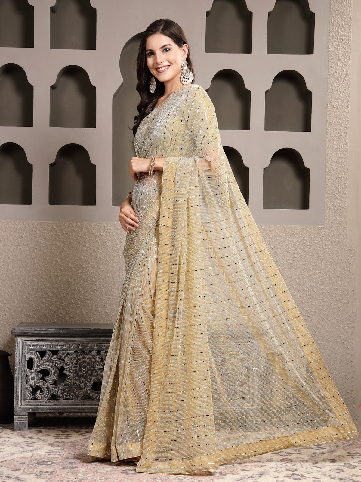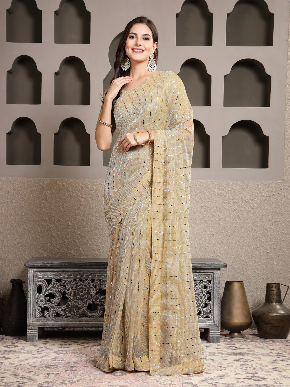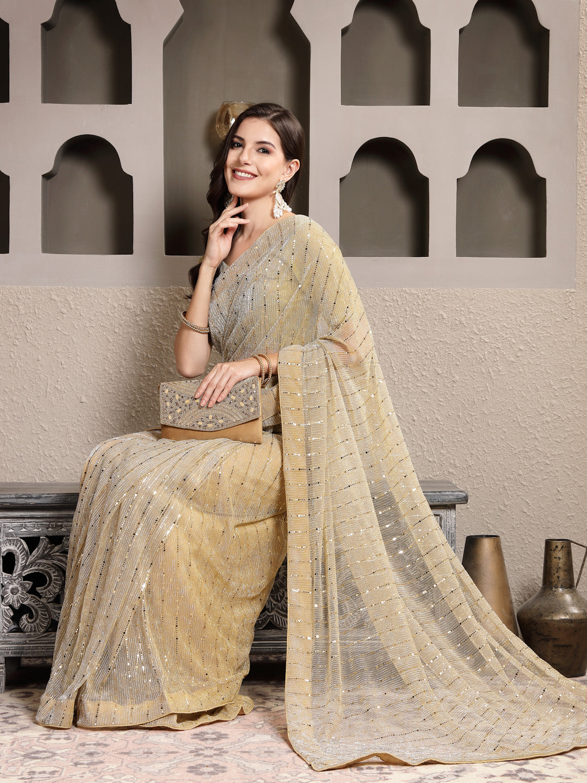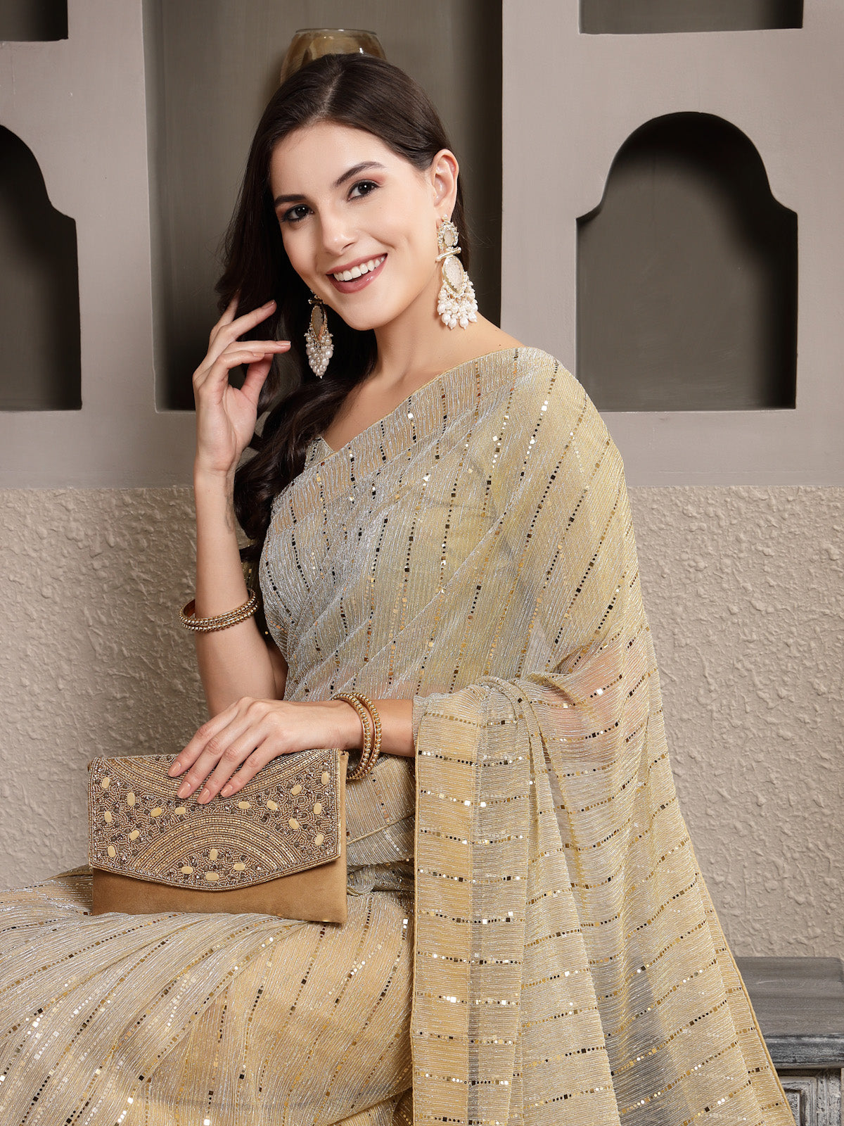 Make a distinct style statement wearing this party wear fancy lycra golden shimmer saree. Made from Lycra Shimmer this saree measures 5.5 Mtr and comes with a 0.80 Mtr unstitched blouse piece.