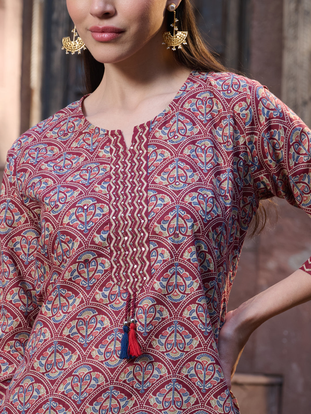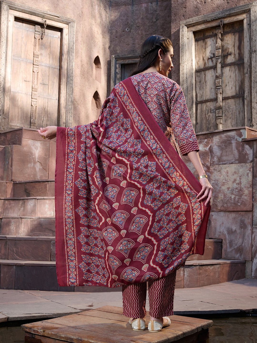 Stylum Women's Red Ethnic Printed Cotton Straight Kurta Pant Dupatta Set (KPDREDPINGA)