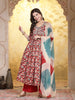 Red Printed flared kurta with beautiful embroidered Alia cut yoke. Solid rayon bottom has fully elasticated belt. Paired with chiffon shaded dupatta with gota detailing. Kurta Length- 47" Inch, Pant Length - 38'' Inch, Dupatta Length - 2.30 mtr.