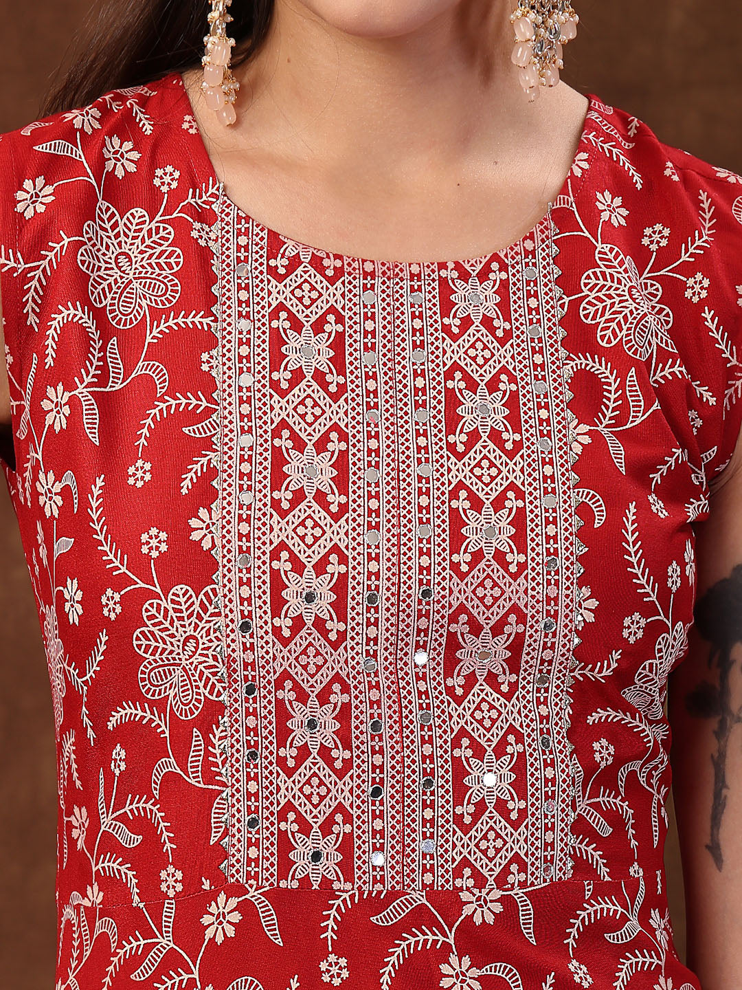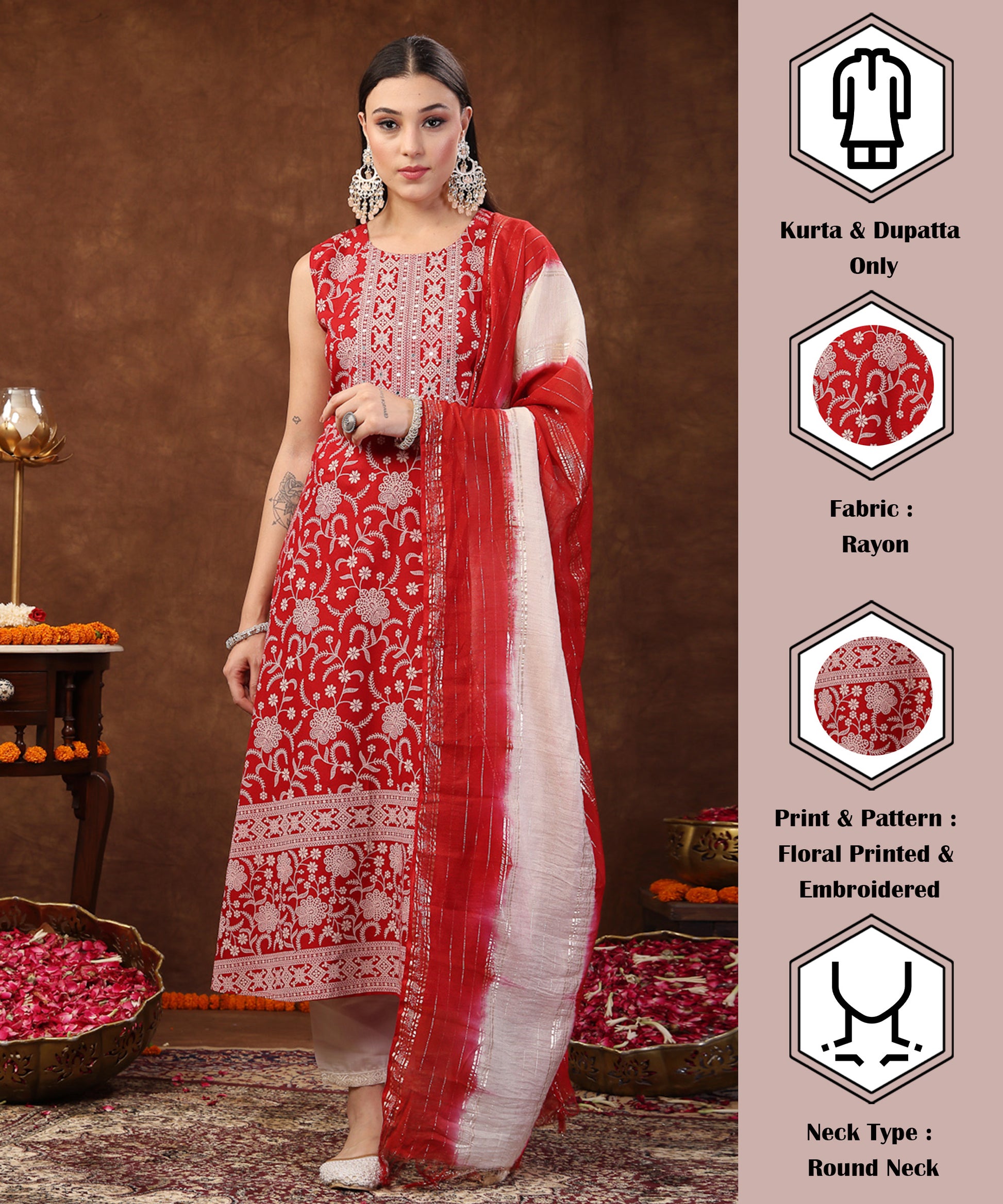 Stylum Women's Red Printed & Embroidered Rayon A-Line Kurta Dupatta Set (KDREDBULL)