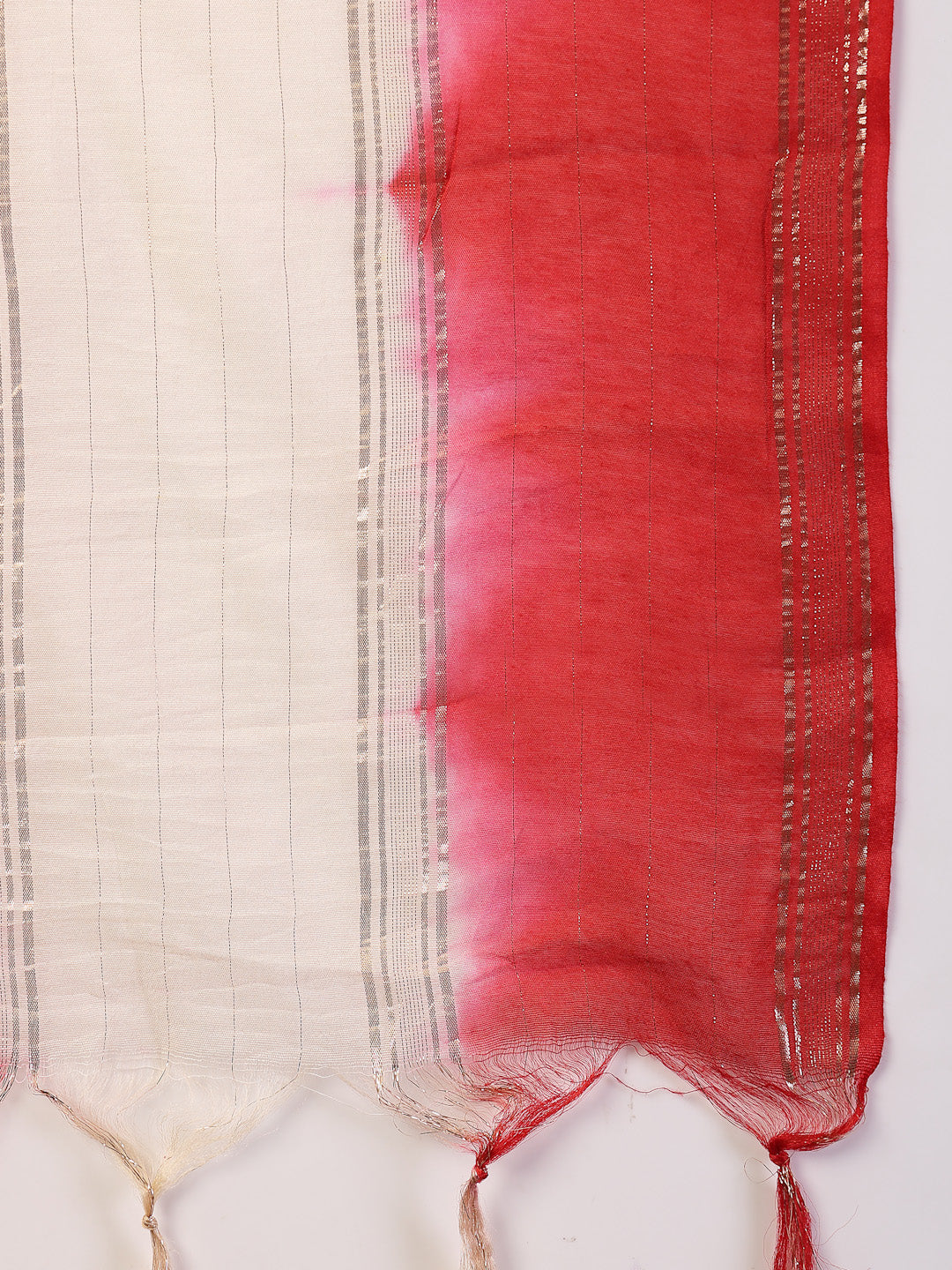 Red khari printed flared kurta dupatta set. Sleeveless kurta has hand embroidery on neckline. Paired with tie & dye lurex dupatta. Kurta Length - 48'' Dupatta Length - 2.30 mtr.