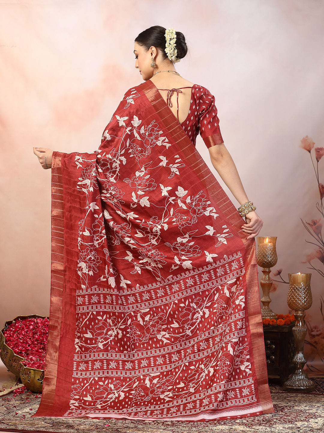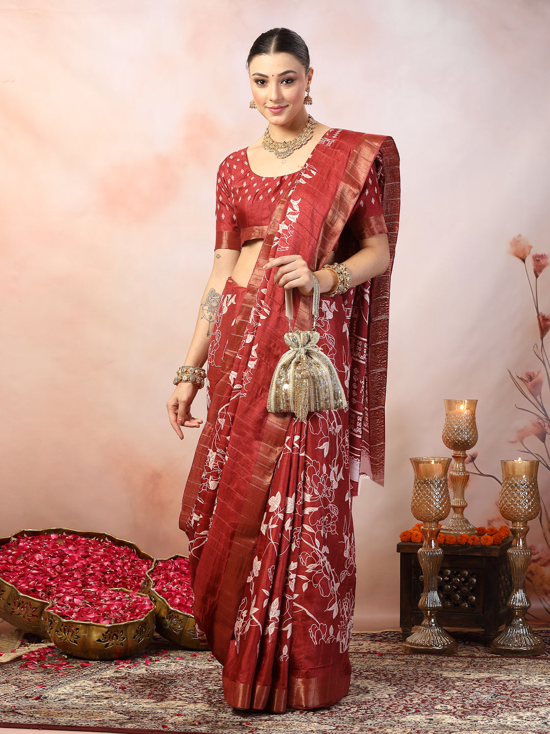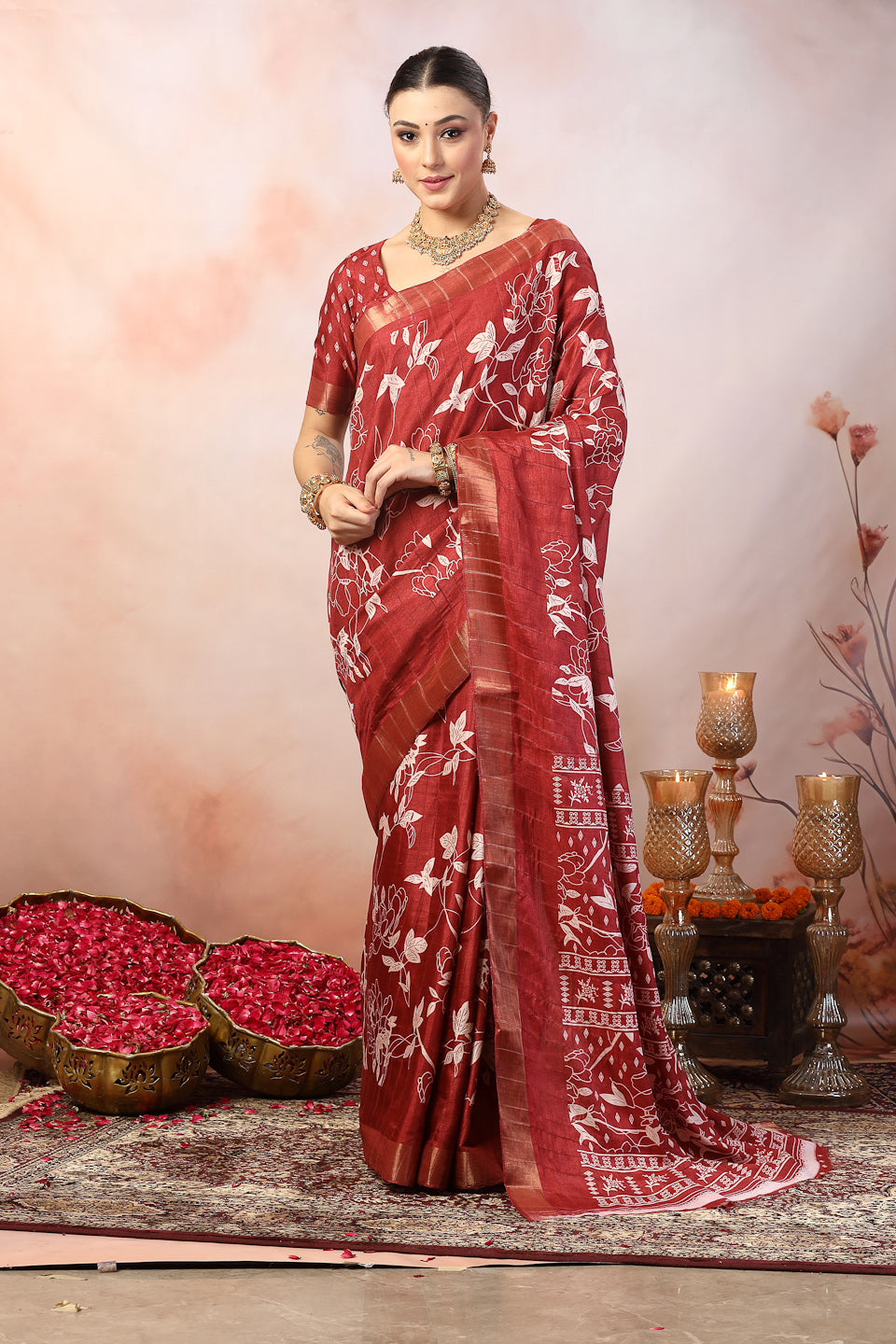 Rose paisley print kankawati silk saree. This ethnic saree has zari border and gold zari stripes. Saree has unstitched blouse. Length - 5.30 mtr, Blouse - .80 mtr