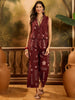 Rust cotton blend geomatric printed co-ord set. Top has button on it, coat collar and sleeveless. Paired with rust printed cotton blend half elasticated waistbelt pant. Top Length- 20'' Inch, Pant Length- 38" Inch.