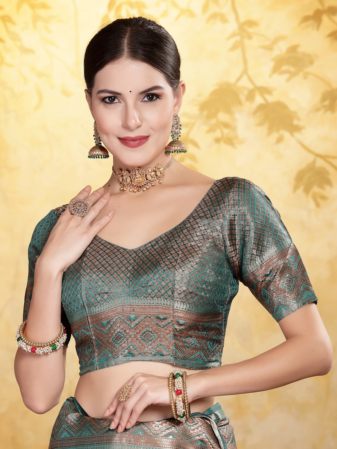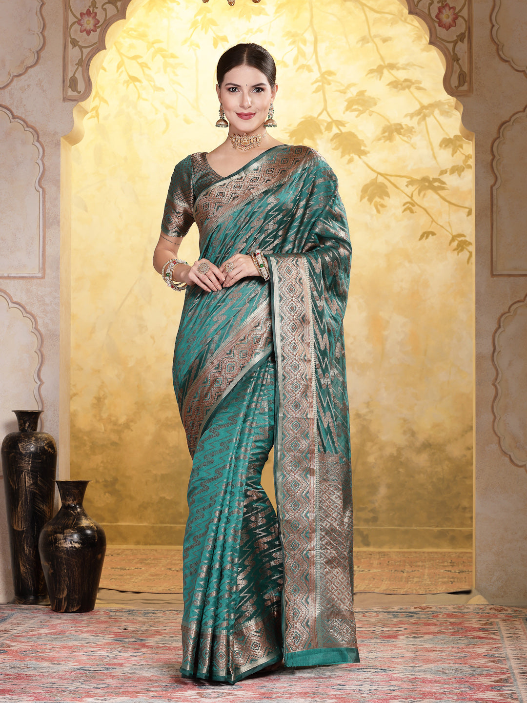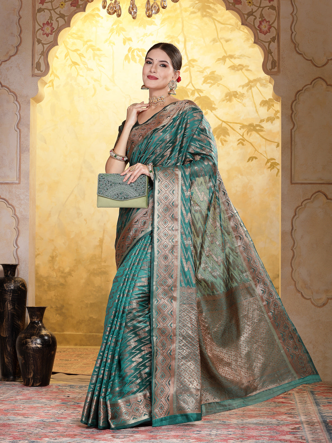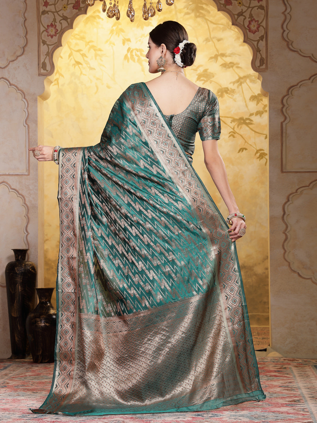 Sea Green Banarsi Organza Saree. This Elegant Party wear Saree Is With Zari Border. Saree Length- 5.5 Mtr, Blouse piece lenght- 0.8 Mtr