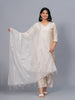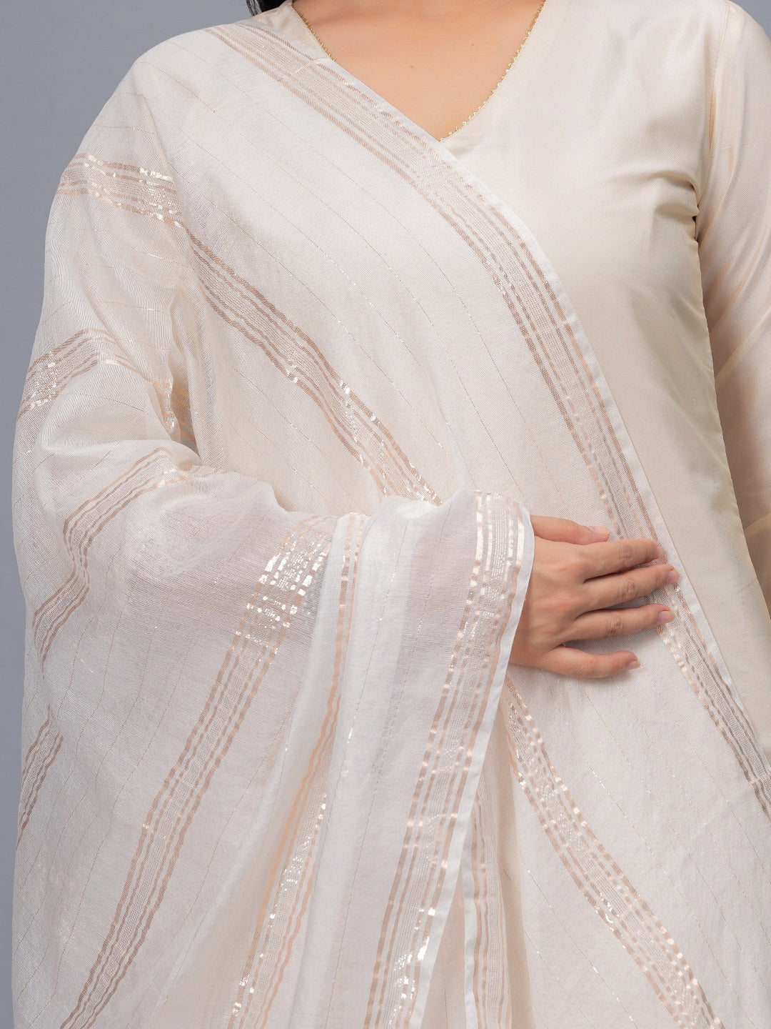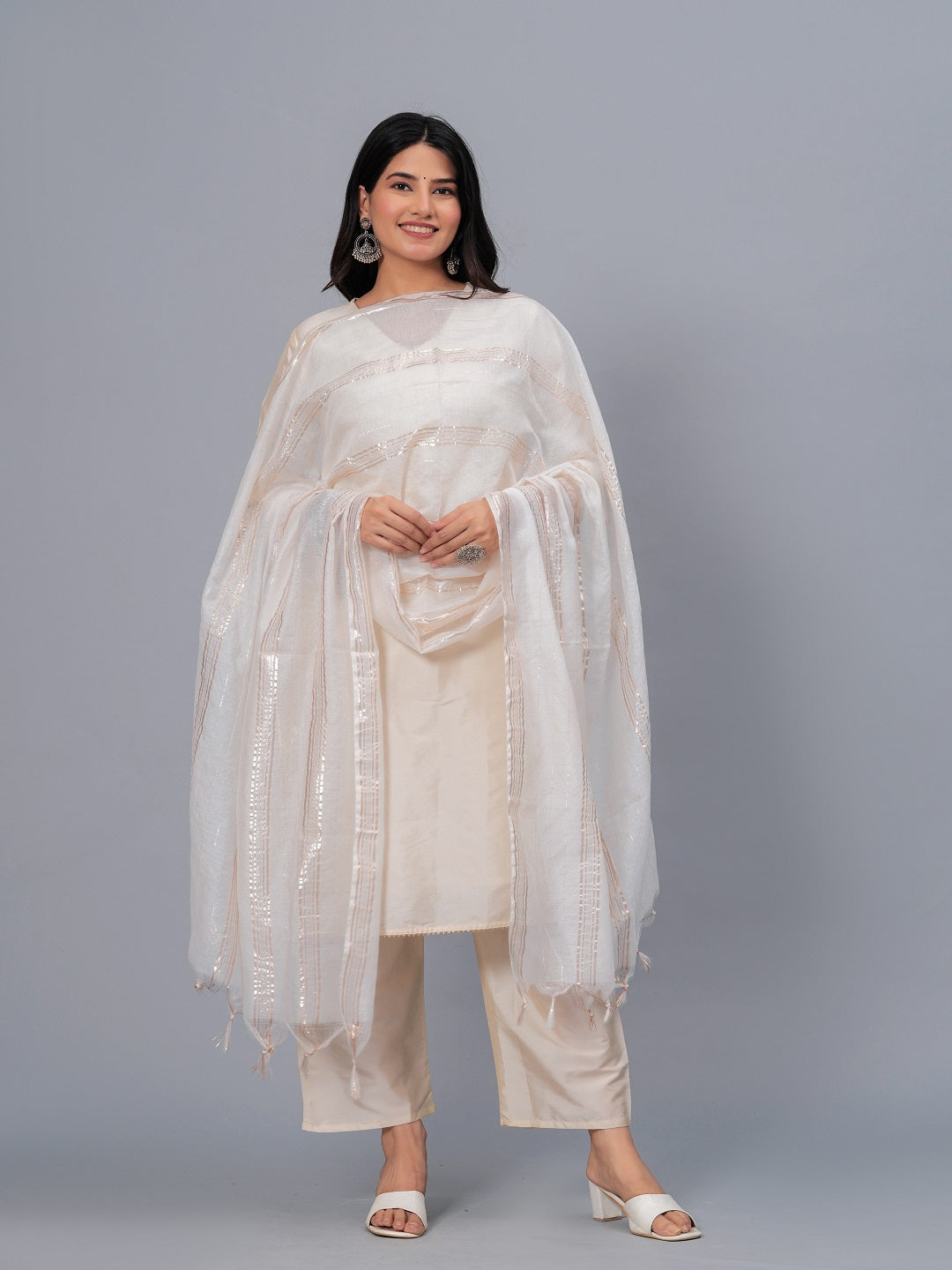 This beautiful viscose rayon white woven design dupatta detailed with fringes and tasseles hem will enhance your look. Pair it with kurti or tunic and mojaris for a charming appeal. You can draw the dupatta in any color. Dupatta Length:- 2.25 Mtr