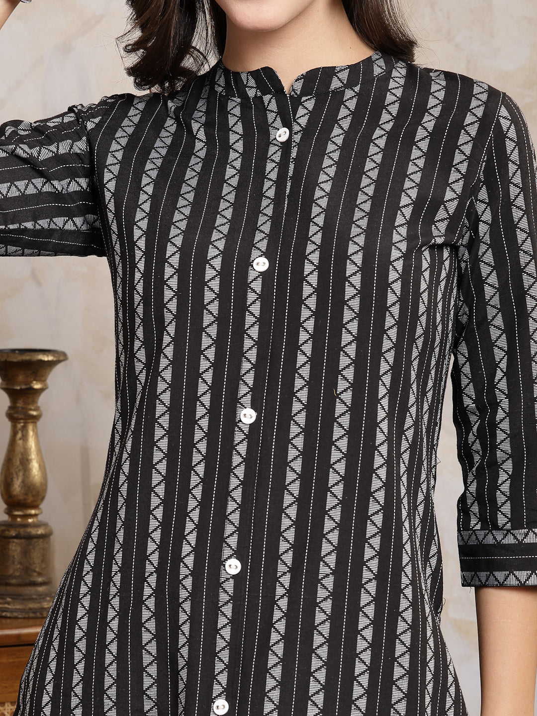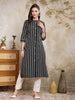 Black colour woven designed cotton blend straight kurta. It has mandarin collar and 3/4 sleeves. It is made of self designed embroidered fabric. Kurta Length -45" Inch. Casual to office wear kurta.