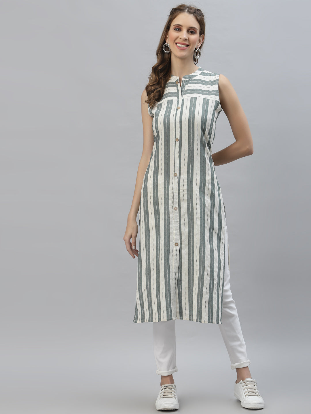 Cotton blend off white self woven striped straight kurta with mandarian neckline, no sleeves and side slit. It has wooden button detailing on front placket. Pair it with denim in crop-cut pattern to complete the look. Product kurta length - 45" inch.